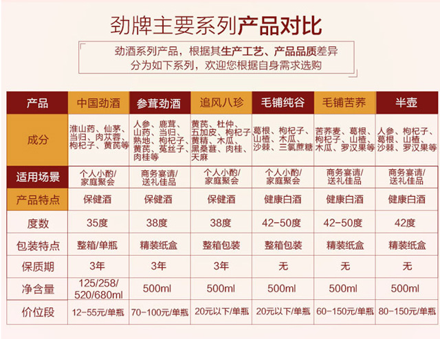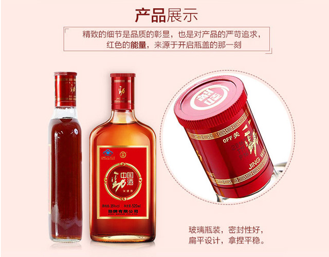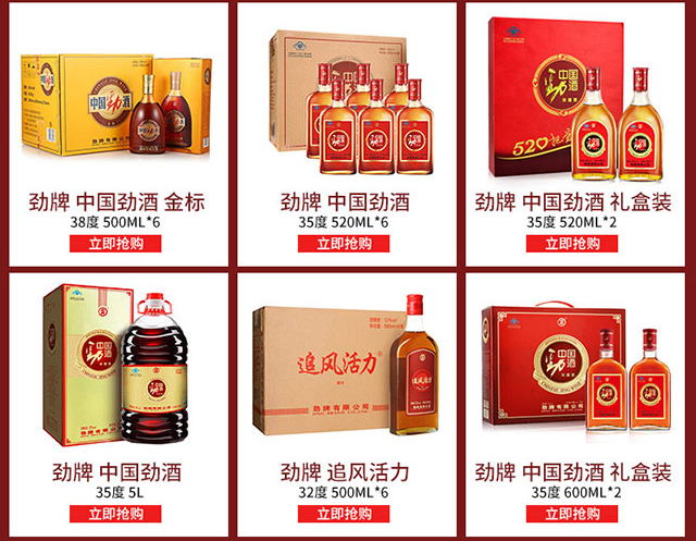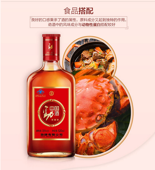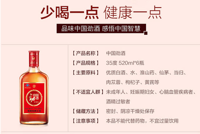 适用场景:商务宴请,自斟自饮,家庭聚会,礼节拜访;包装:整箱装;容量:500-999mL;度数:35-39度;产地:湖北;保质期:1095;酒精度:35;存储方法:干燥、通风、避光;容量:500mL;产品重量:6.4kg;包装清单:中国劲酒 35度 520ml x 6;