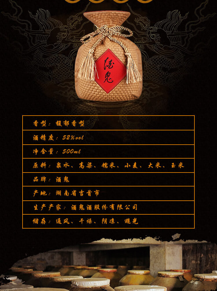 包装:瓶装;容量:376-499mL;香型:馥郁香型;产地:湖南;度数:50度及以上;酒精度:52%vol;容量:500ml;产品重量:454g;包装清单:52度酒鬼酒原浆500ml× 1;
