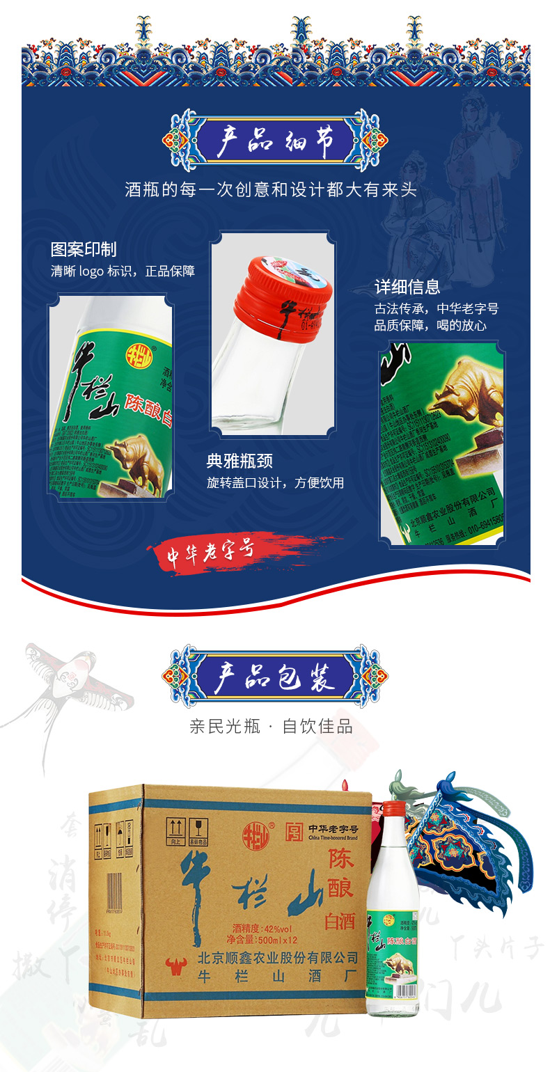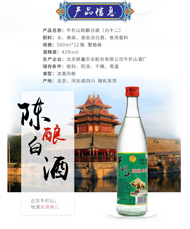 包装:整箱装;容量:376-499mL;香型:浓香型;产地:河北;度数:40-49度;酒精度:40%vol;容量:500ml;产品重量:102900g;包装清单:牛栏山 陈酿白酒 42度 500ml*12瓶 整箱装 (白牛二/牛白瓶)浓香风格白酒*1;