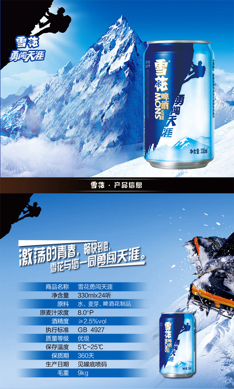 国产/进口:国产;产地:中国大陆;适用场景:家庭聚会,礼节拜访,情侣约会,自斟自饮,派对必备,烧烤撸串,酒吧夜店;包装:听装;容量:330mL;类别:黄啤酒;容量:330ml;产品重量(kg):8.9;包装:听装;原料:水、麦芽、啤酒用糖浆、啤酒花;存储方法:5°C-25°C 干燥、避光贮藏;原麦汁浓度:8.0°P;酒精度:≥2.5%vol;国产/进口:国产;保质期:360天;原产地:中国;类别:黄啤酒;包装清单:雪花啤酒(Snowbeer) 勇闯天涯330ml*24听;