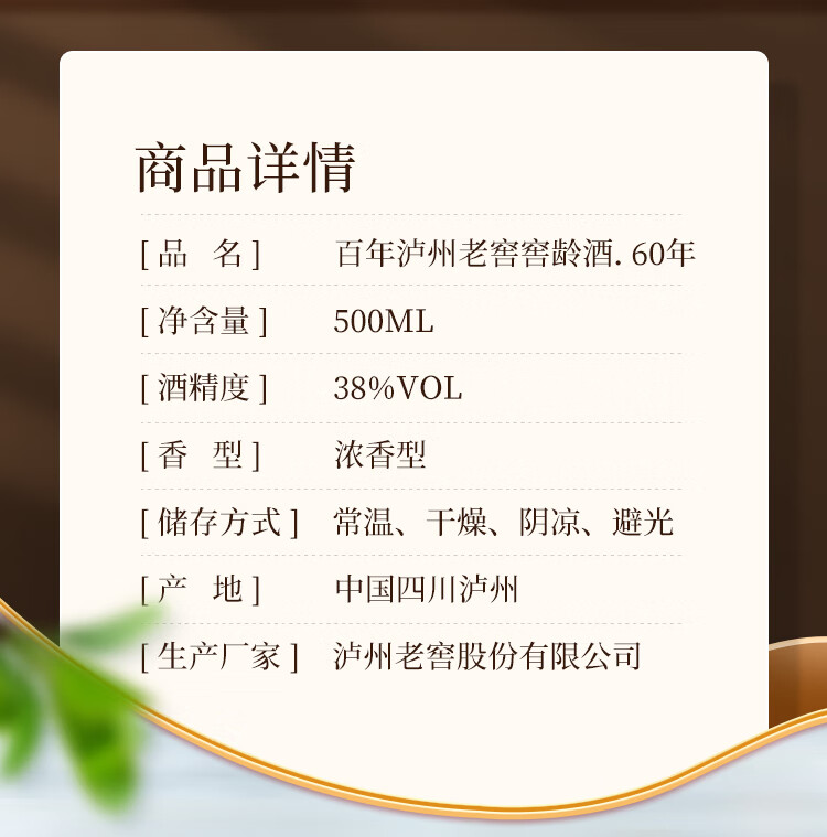包装:瓶装;容量:376-499mL;香型:浓香型;产地:四川;度数:35-39度;酒精度:38%vol;容量:500ml;产品重量:1630g;包装清单:白酒 × 1;