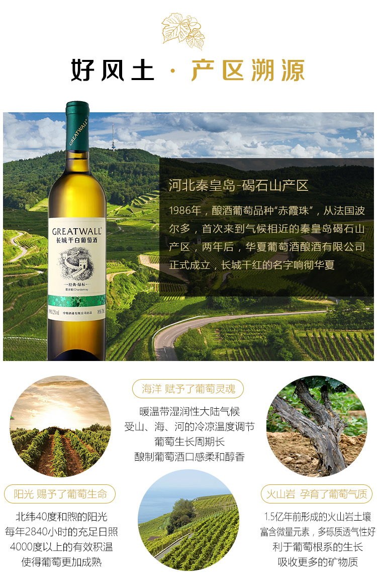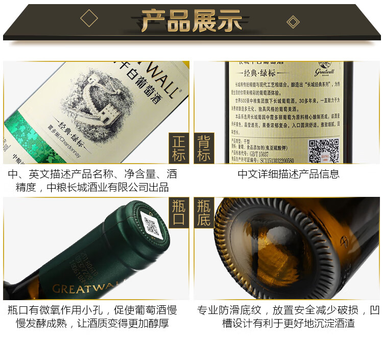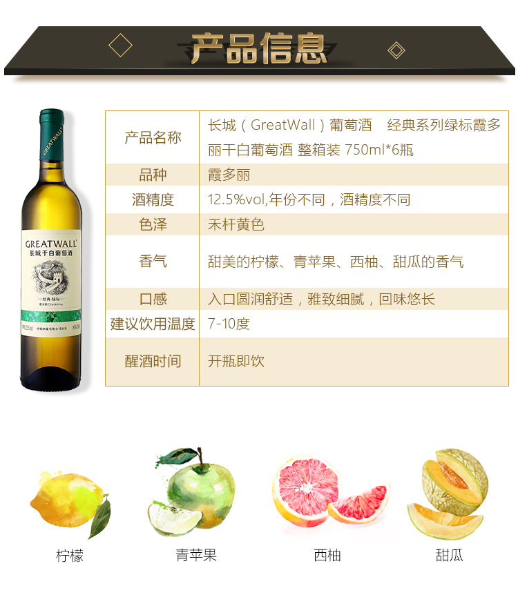 颜色:柠檬黄;口感:清新;特性:其它;国产/进口:国产;适用场景:家庭聚会,礼节拜访,商务宴请,婚礼婚宴,情侣约会,自斟自饮,闺蜜私语,派对活动;包装:整箱装;酸度:中酸;类别:白葡萄酒;葡萄品种:霞多丽(Chardonnay);类型:静止酒;香型:果香;产地:中国大陆;容量:750mL;甜度:干型;系列:经典;保质期:3650天;酒精度:12.5%vol;原产地:中国大陆;存储方法:避免阳光直射,于5℃~25℃干燥通风处卧放或倒放为宜。;容量:750ml;产品重量:8.06kg;包装清单:华夏长城经典绿标霞多丽干白葡萄酒 整箱装 750ml*6瓶;