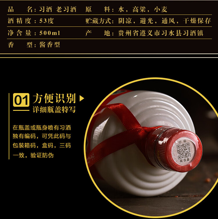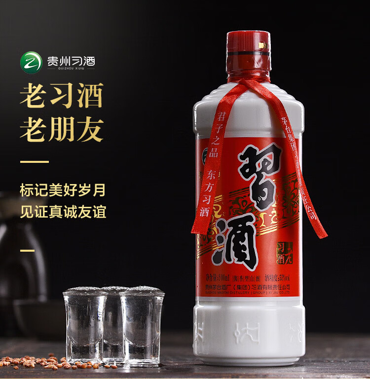包装:瓶装;容量:500-749mL;香型:酱香型;度数:50度及以上;香型:酱香型;产地:贵州;酒精度:53%vol;包装:瓶装;容量:500ml;产品重量:1.06g;包装清单:老习酒 53度 500ml X 1;
