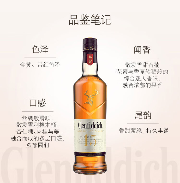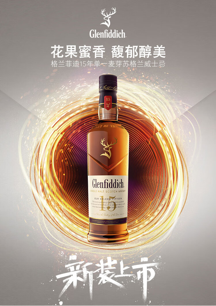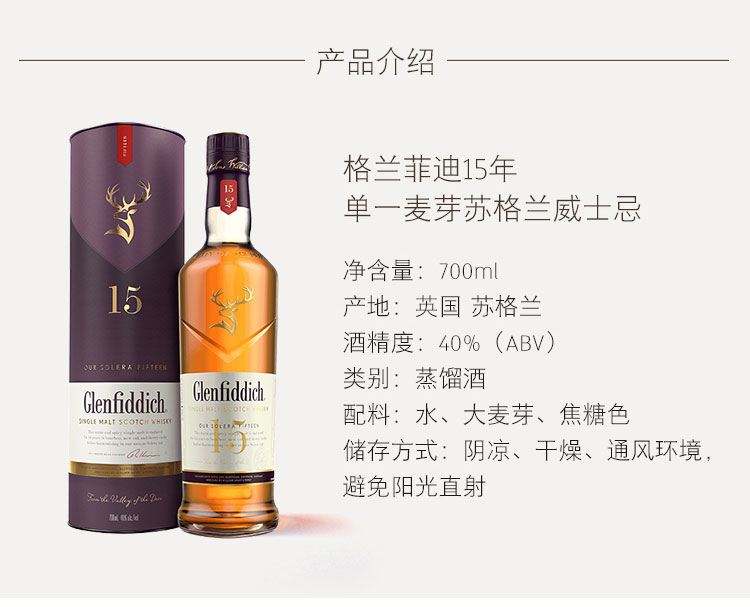类型:单一麦芽威士忌;产地:苏格兰;适用场景:闺蜜私语,自斟自饮,亲友馈赠,家庭聚会,商务宴请;包装:瓶装;容量:700-999mL;阶段:进阶优选;原料:水、大麦芽、焦糖色;保质期:无;酒精度:40%vol;存储方法:常温避光保存;产品重量:1.5kg;容量:700mL;包装清单:格兰菲迪(Glenfiddich)15年苏格兰达夫镇单一麦芽威士忌700ml *1;