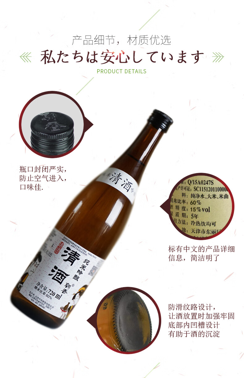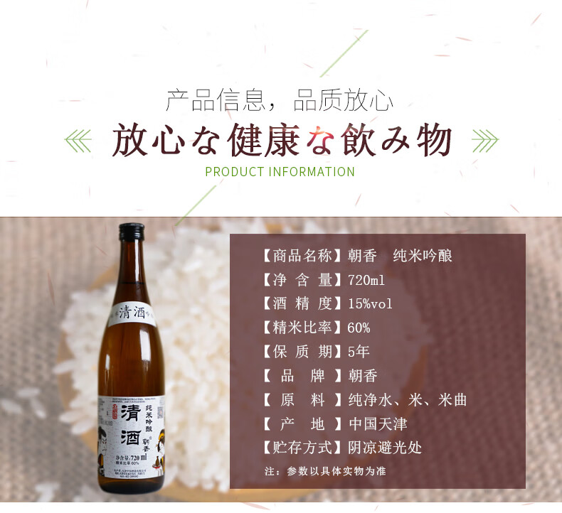 适用场景:家庭聚会,自斟自饮;包装:瓶装;容量:200-374mL;国产/进口:国产;产地:中国大陆;原料:纯净水、大米、米曲;产地:其它;保质期:5年;酒精度:15%vol;存储方法:阴凉避光处;包装:瓶装;容量:720mL;产品重量:2kg;包装清单:朝香 米酒 纯米吟醸720ml*1;