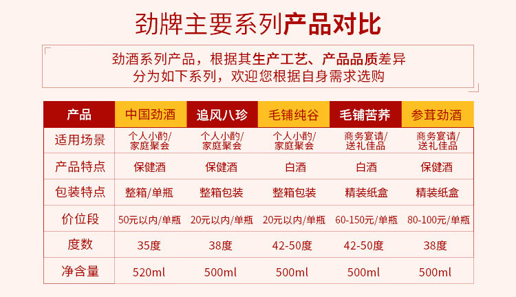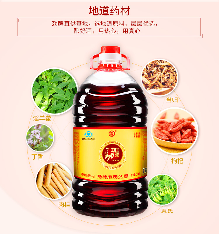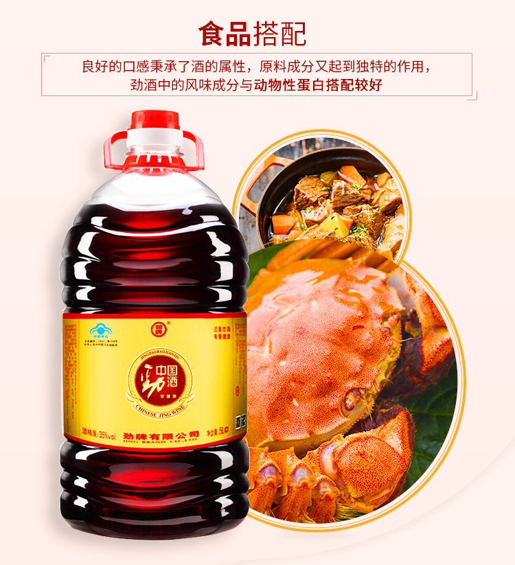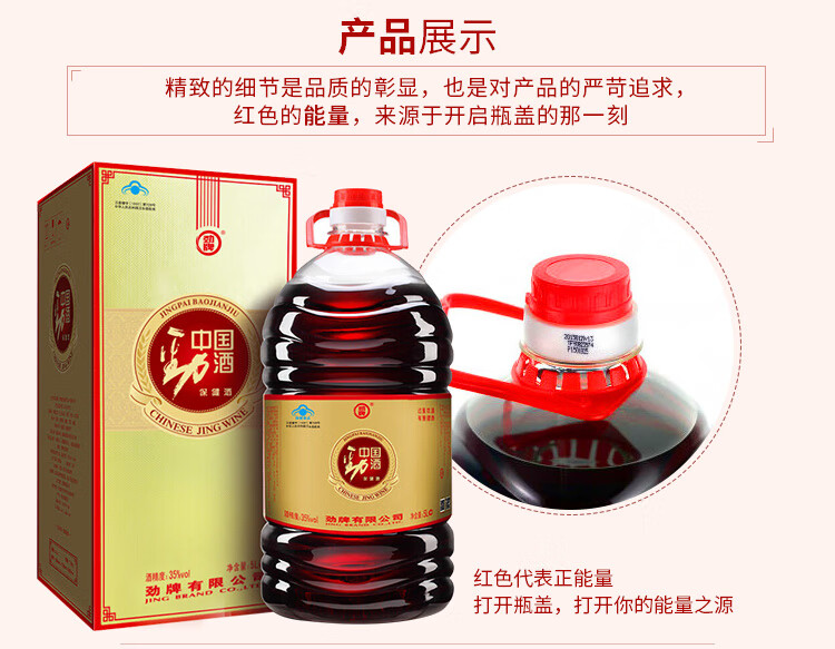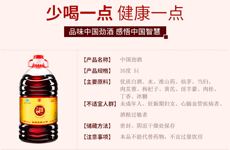 适用场景:自斟自饮,家庭聚会,礼节拜访;包装:桶装;容量:1-5L;度数:35-39度;产地:湖北;保质期:3年;酒精度:35度;存储方法:阴凉干燥处保存;容量:5000mL;产品重量:0kg;包装清单:劲牌 中国劲酒 35度 5L*1;