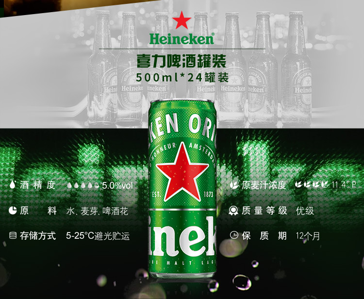 国产/进口:国产;产地:中国大陆;适用场景:礼节拜访,家庭聚会,自斟自饮,情侣约会,烧烤撸串,派对必备,酒吧夜店;包装:听装;容量:500mL;类别:黄啤酒;原料:水、麦芽、啤酒花;保质期:12个月;酒精度:5.0%vol;原产地:中国大陆;原麦汁浓度:11.4°P;存储方法:5°-25°避光贮运;容量:500ml;产品重量:12.90kg;包装清单:喜力啤酒500ml*24;