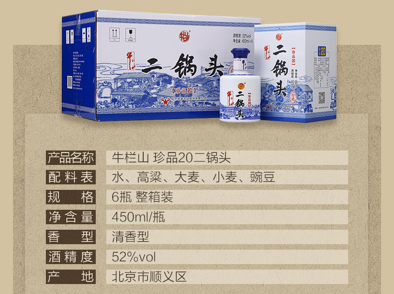 包装:整箱装;容量:376-499mL;香型:清香型;产地:北京;度数:50度及以上;酒精度:52%vol;容量:450ml*6;产品重量:8090g;包装清单:牛栏山 珍品二十 二锅头 52度 450ml*6瓶 整箱装 清香型白酒(内含三个礼品袋)*1;