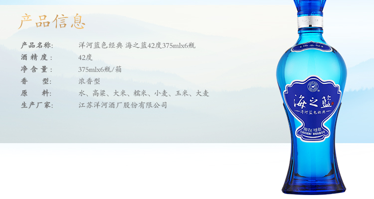 包装:整箱装;容量:376-499mL;香型:浓香型;度数:40-49度;香型:浓香型;产地:江苏;酒精度:42;包装:整箱装;产品重量:0g;容量:375;包装清单:洋河蓝色经典 海之蓝 42度 375ml*6、礼袋×3;