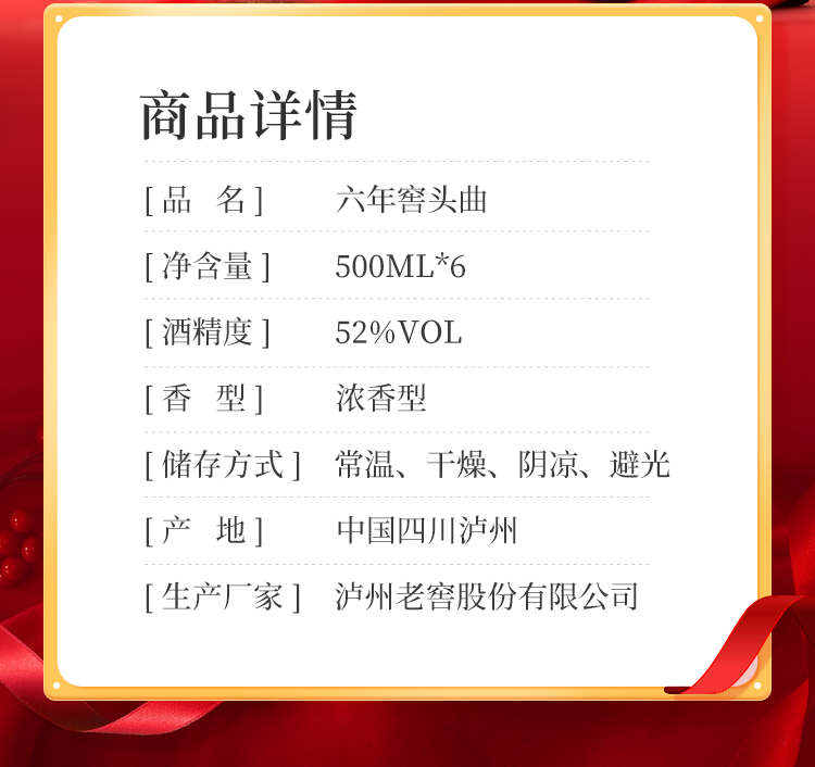 包装:整箱装;容量:376-499mL;香型:浓香型;产地:四川;度数:50度及以上;酒精度:52%vol;容量:500ml*6瓶;产品重量:9300g;包装清单:六年陈头曲×6;