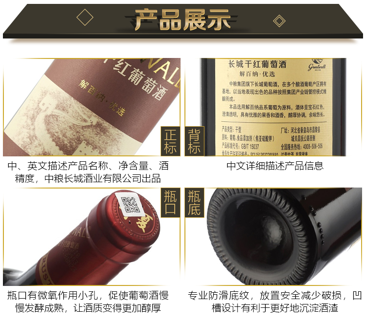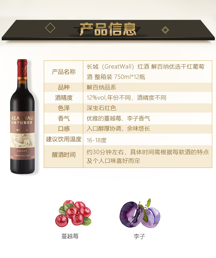 颜色:宝石红;口感:饱满;特性:其它;国产/进口:国产;适用场景:家庭聚会,礼节拜访,商务宴请,婚礼婚宴,情侣约会,自斟自饮,派对活动;包装:整箱装;酸度:中酸;类别:红葡萄酒;葡萄品种:其它;类型:静止酒;香型:果香;产地:中国大陆;容量:750mL;甜度:干型;保质期:3650天;酒精度:12%vol;原产地:中国大陆;存储方法:避免阳光直射,于5℃~25℃干燥通风处卧放或倒放为宜;容量:750ml;产品重量:15.92kg;包装清单:长城解百纳优选干红葡萄酒 畅饮整箱装 750ml*12瓶;