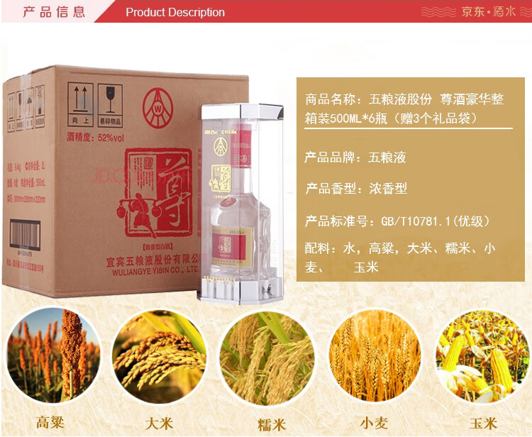 包装:整箱装;容量:750mL及以上;香型:浓香型;产地:四川;度数:50度及以上;酒精度:52%vol;容量:500ml*6;产品重量:9g;包装清单:宜宾五粮液股份有限公司 尊酒豪华装52度整箱装 500ml*6瓶(配三个双支装礼品袋);