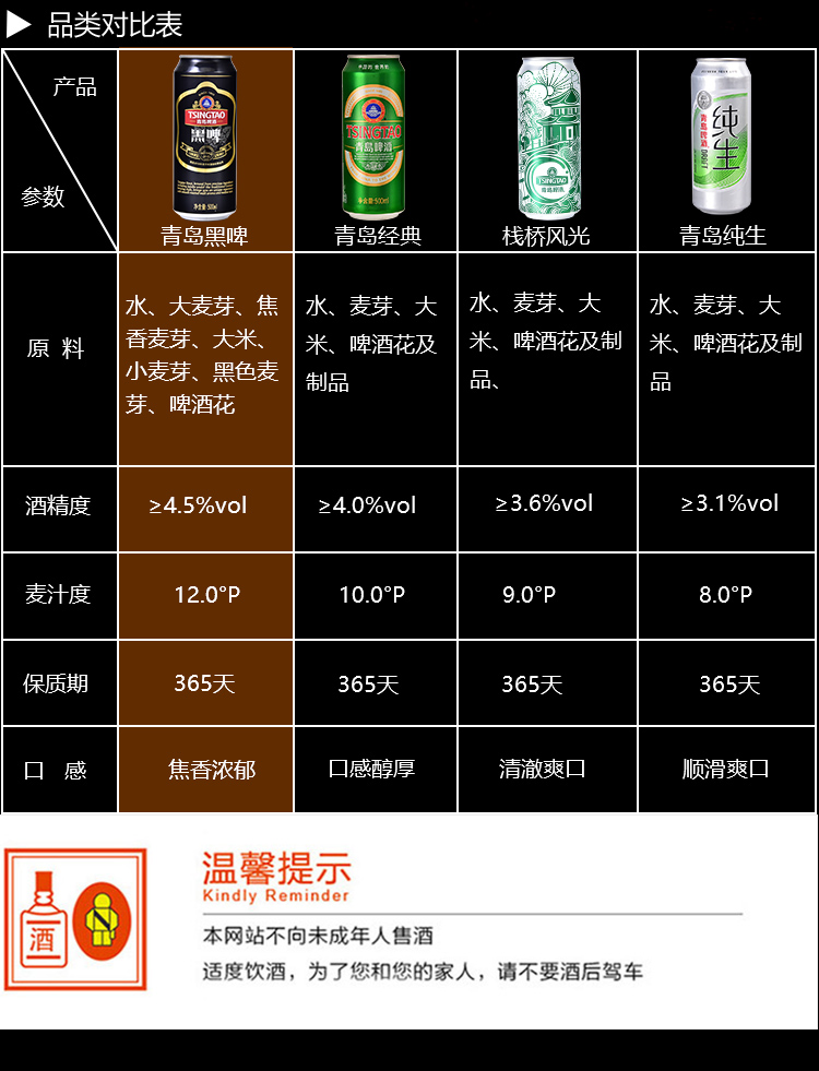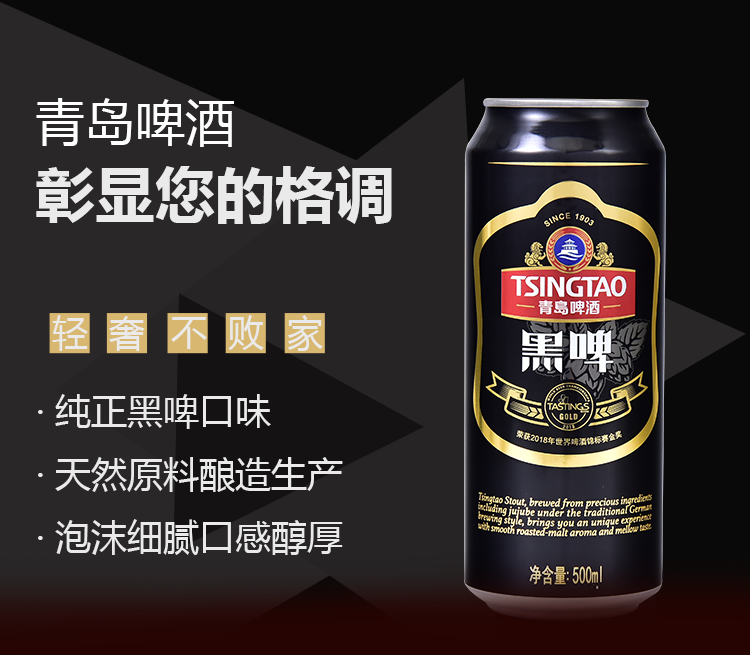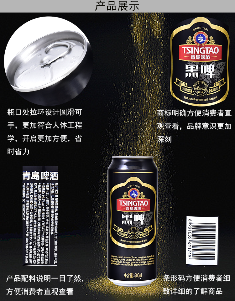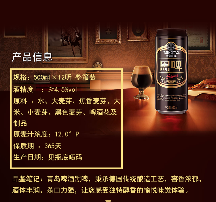 国产/进口:国产;产地:中国大陆;适用场景:家庭聚会,礼节拜访,情侣约会,自斟自饮,派对必备,烧烤撸串,酒吧夜店;包装:听装;容量:500mL;类别:黑啤酒;原料:水、焦香麦芽、大米、小麦芽、黑色麦芽、啤酒花及制品;国产/进口:国产;保质期:365天;酒精度:≥4.5%vol;原产地:中国大陆;原麦汁浓度:12.0°P;存储方法:避光贮存,禁止加热或0℃以下冷藏;类别:黑啤酒;包装:听装;产品重量(kg):6kg;容量:500ml;包装清单:青岛啤酒(Tsingtao)黑啤500ml*12听 德国进口工艺大罐整箱装 经典窖藏 浓郁顺滑 整箱装×1箱;