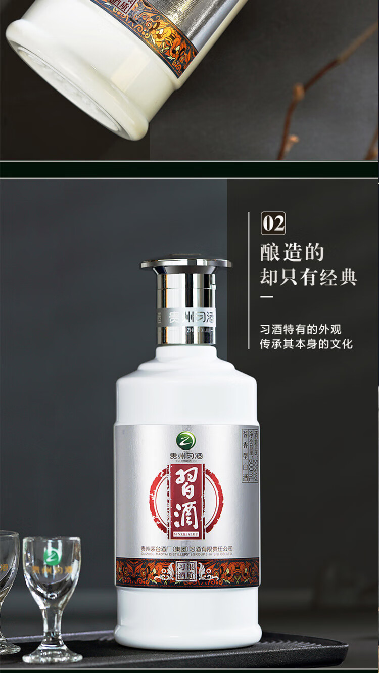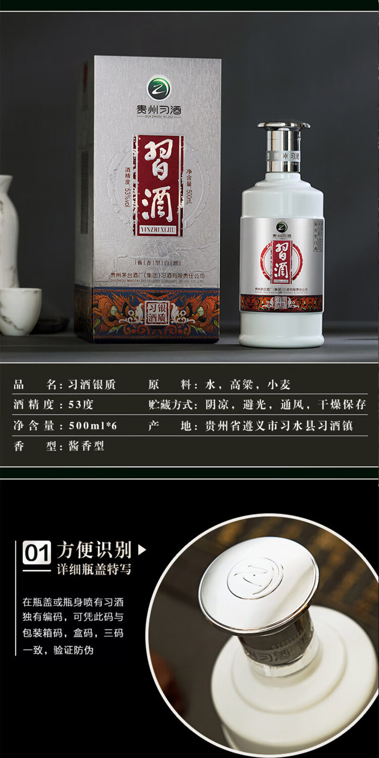 包装:整箱装;容量:500-749mL;香型:酱香型;产地:贵州;度数:50度及以上;酒精度:53%vol;容量:3000ml;产品重量:7.57g;包装清单:习酒银质 53度500ml X 6;