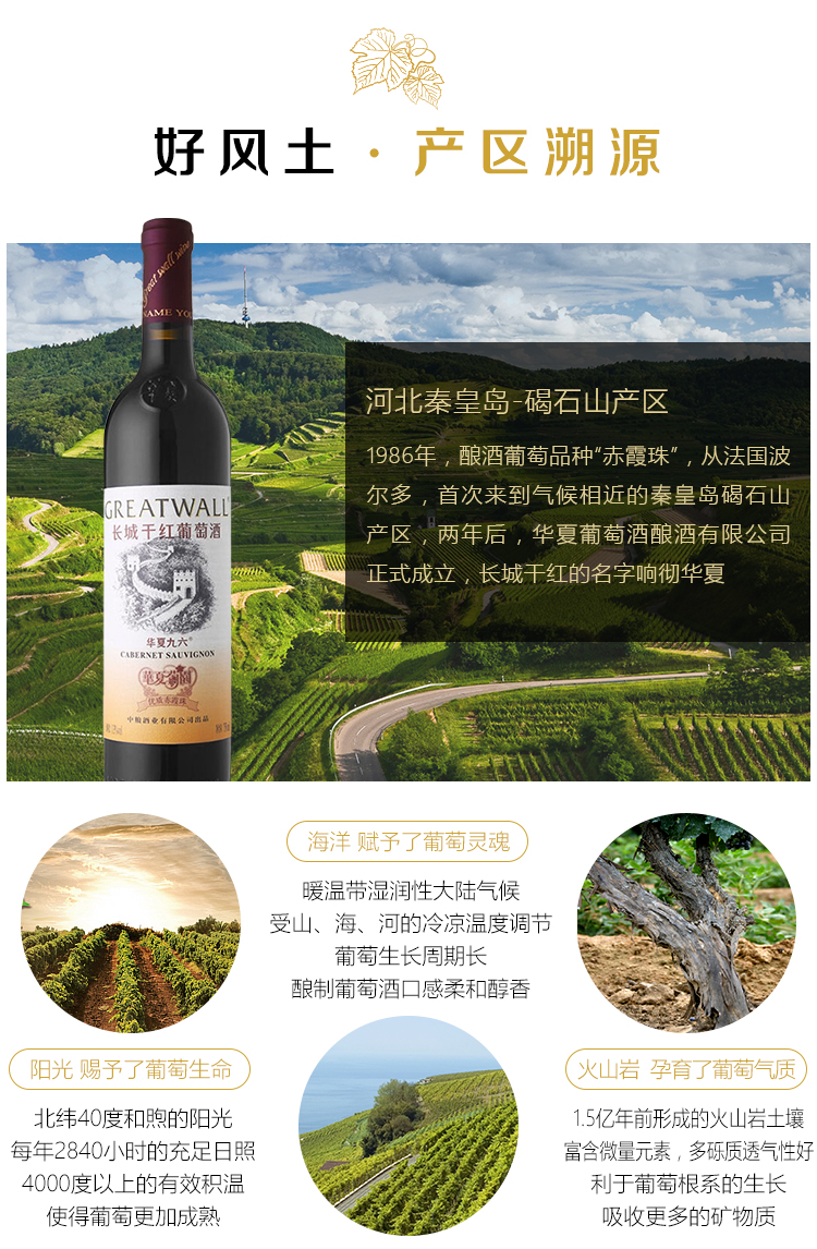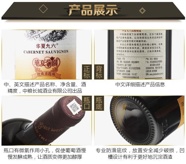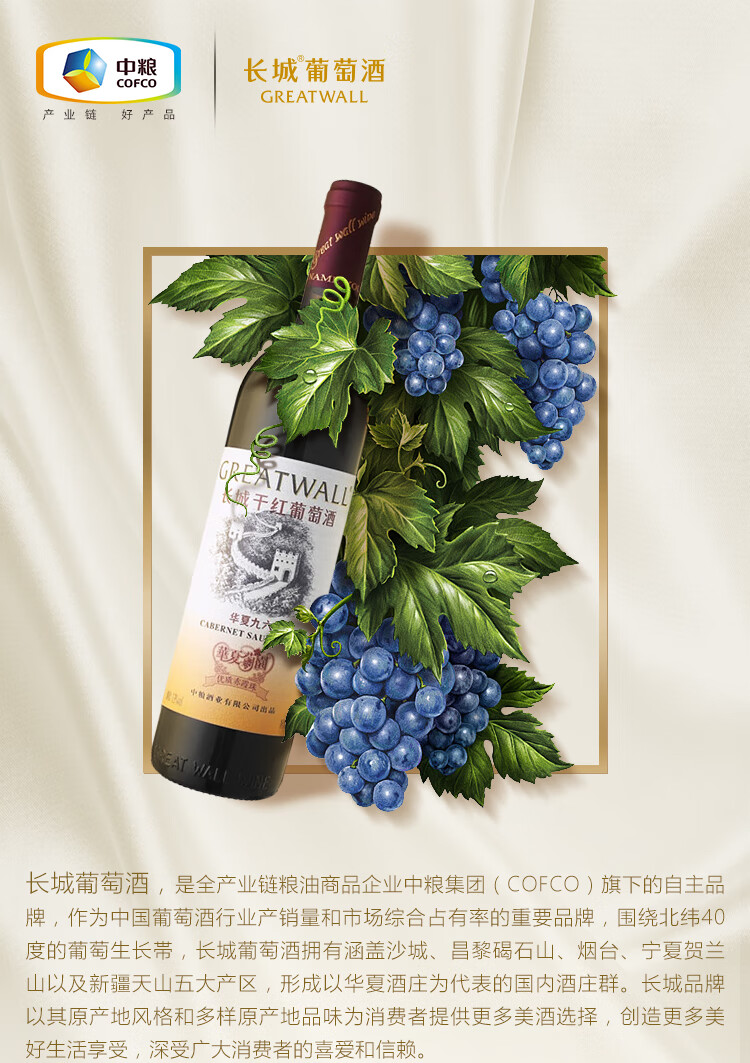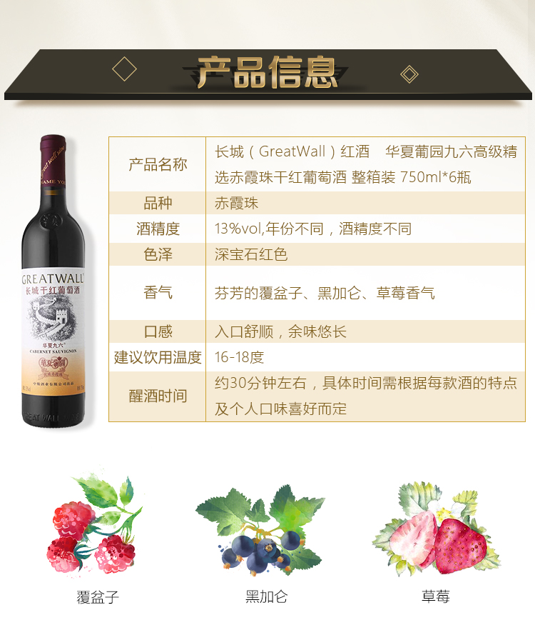 颜色:宝石红;口感:饱满;特性:其它;国产/进口:国产;适用场景:家庭聚会,礼节拜访,商务宴请,婚礼婚宴,情侣约会,自斟自饮,闺蜜私语,派对活动;包装:整箱装;酸度:中酸;类别:红葡萄酒;葡萄品种:赤霞珠(Cabernet Sauvignon);类型:静止酒;香型:果香;产地:中国大陆;容量:750mL;甜度:干型;系列:华夏葡园;保质期:3650天;酒精度:13%vol;原产地:中国大陆;存储方法:避免阳光直射,于5℃~25℃干燥通风处卧放或倒放为宜。;容量:750ml;产品重量:8.03kg;包装清单:长城华夏葡园九六高级精选赤霞珠干红葡萄酒 整箱装 750ml*6瓶;