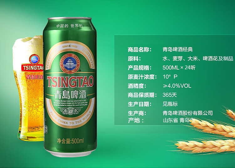 国产/进口:国产;产地:中国大陆;适用场景:家庭聚会,礼节拜访,情侣约会,自斟自饮,派对必备,烧烤撸串,酒吧夜店;包装:听装;容量:500mL;类别:黄啤酒;原料:水、麦芽、大米、啤酒花;国产/进口:国产;保质期:365天;酒精度:≥4.0°;原产地:中国大陆;原麦汁浓度:10°P;存储方法:避光贮存,禁止加热或0℃以下冷藏;类别:黄啤酒;包装:听装;产品重量:12.98kg;容量:500ml;包装清单:青岛(Tsingtao)啤酒经典10度500ml*4*6听 整箱×1;