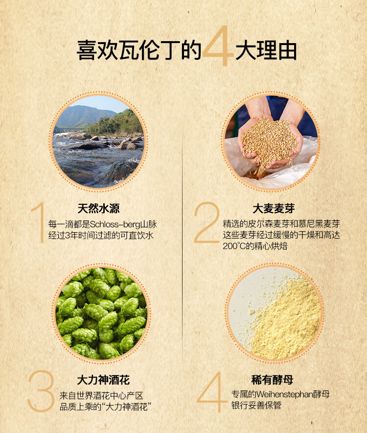 国产/进口:进口;产地:德国;适用场景:家庭聚会,礼节拜访,情侣约会,自斟自饮,派对必备,烧烤撸串,酒吧夜店;包装:听装;容量:500mL;类别:黑啤酒;原料:水、啤酒麦芽、酒花浸膏;保质期:15个月;酒精度:4.9;原产地:德国;原麦汁浓度:11.5;存储方法:阴凉干燥处保存;产品重量:12.56kg;容量:500ml;包装清单:德国进口 Wurenbacher瓦伦丁黑啤 500ml*24 听;
