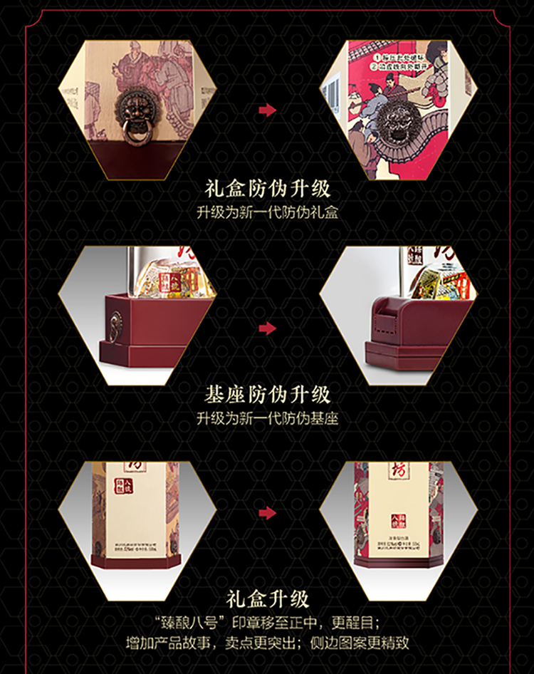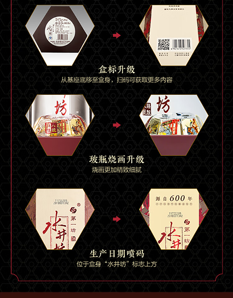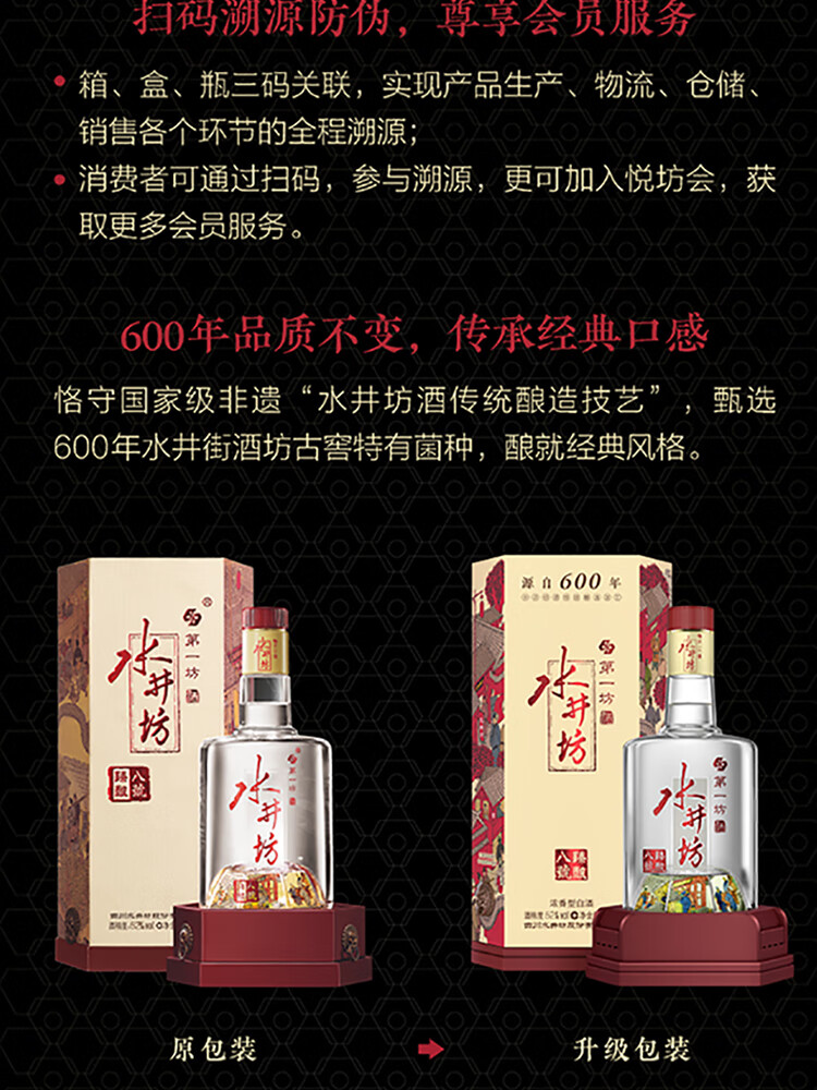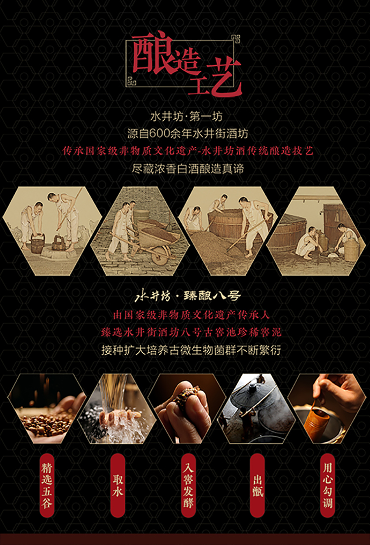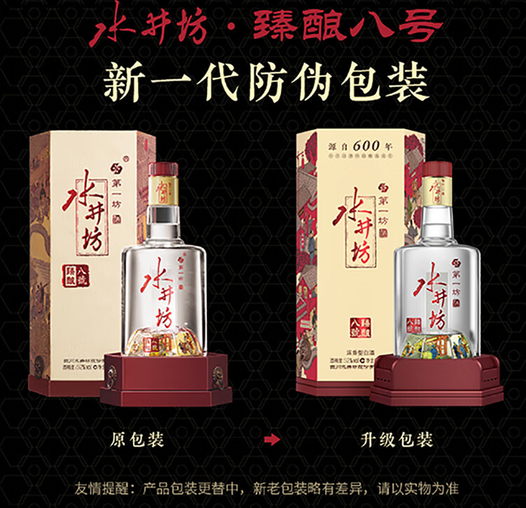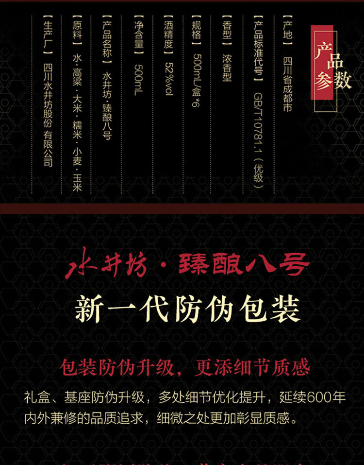 包装:整箱装;容量:500-749mL;香型:浓香型;产地:四川;度数:50度及以上;酒精度:52%vol;容量:500ml*6;产品重量:9000g;包装清单:水井坊 臻酿八號 52度 500ml X 6瓶;