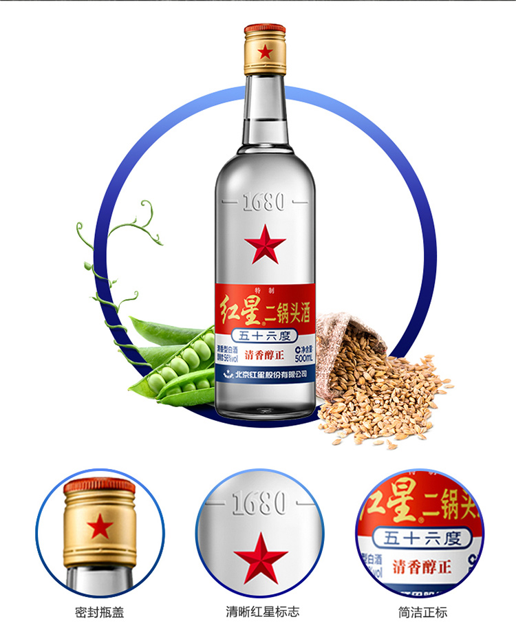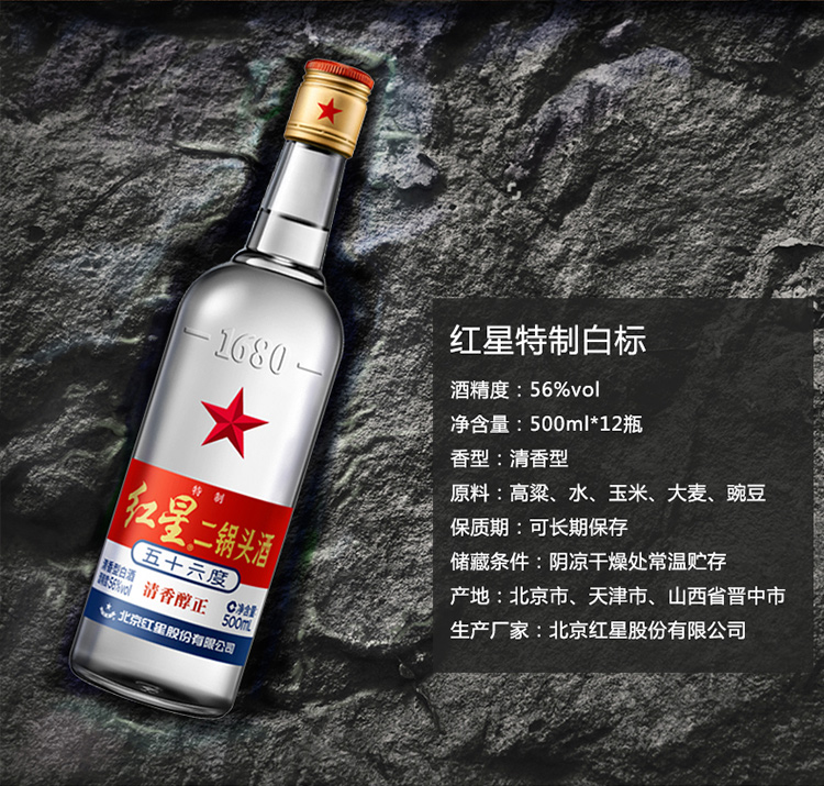 包装:整箱装;容量:376-499mL;香型:清香型;度数:50度及以上;产地:北京市,天津市,山西晋中市;酒精度:56%vol;产品重量:10380g;容量:500ml;包装清单:红星 特制白标 二锅头56度 500ml*12 整箱装;