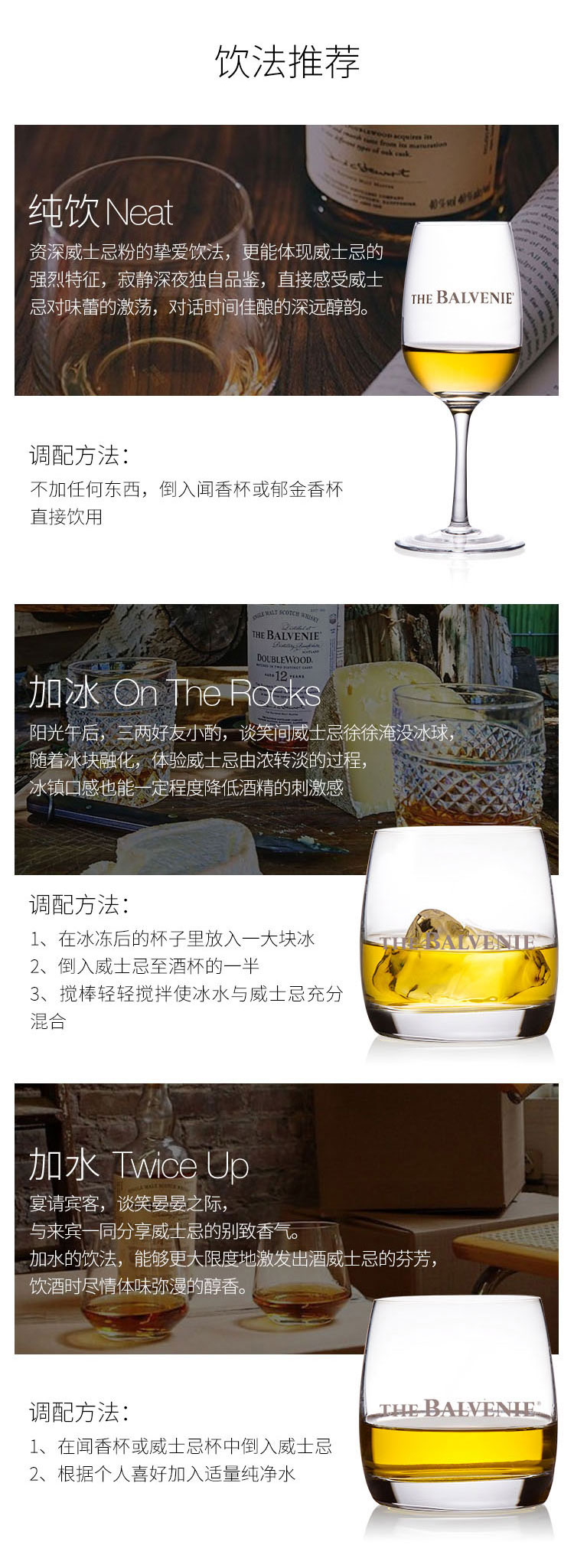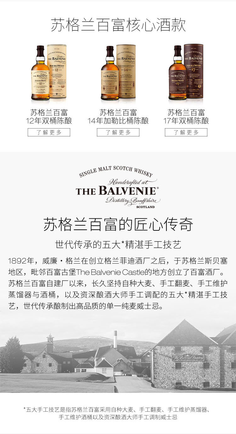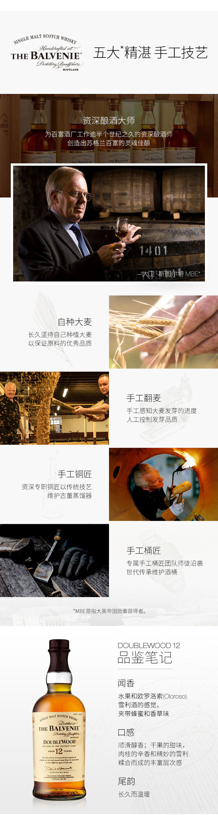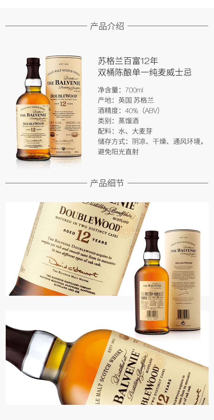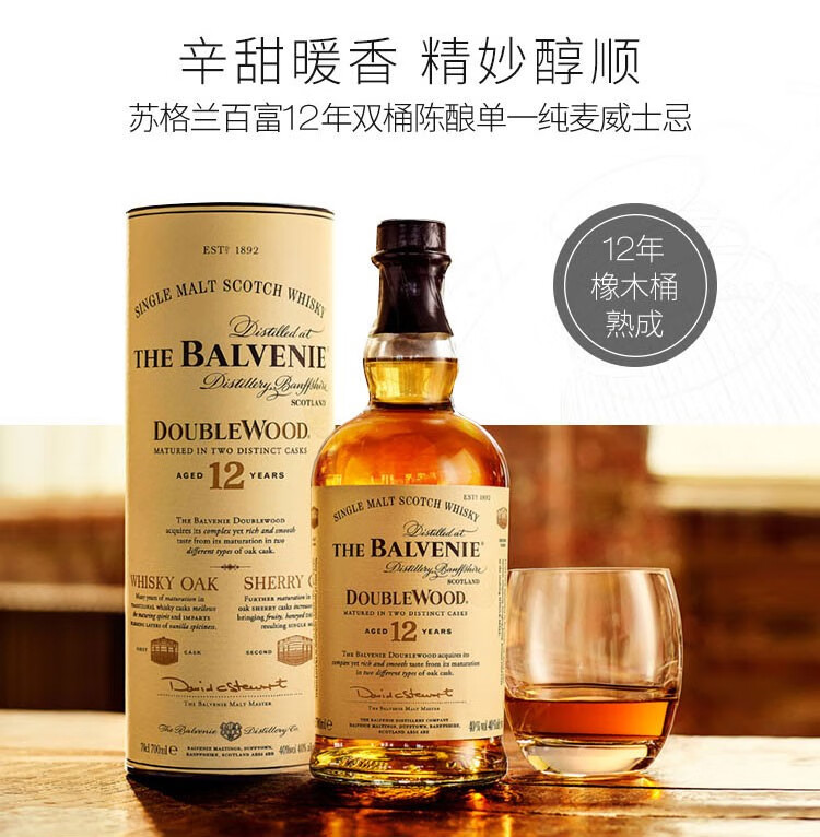 类型:单一麦芽威士忌;产地:苏格兰;适用场景:自斟自饮,亲友馈赠,家庭聚会,商务宴请;包装:瓶装;容量:700-999mL;阶段:进阶优选;原料:水、大麦芽;保质期:长期;酒精度:40%vol;存储方法:常温贮存;产品重量:1.5kg;容量:700mL;包装清单:百富(The Balvenie)洋酒 百富12年 双桶陈酿单一麦芽苏格兰威士忌700ml *1;