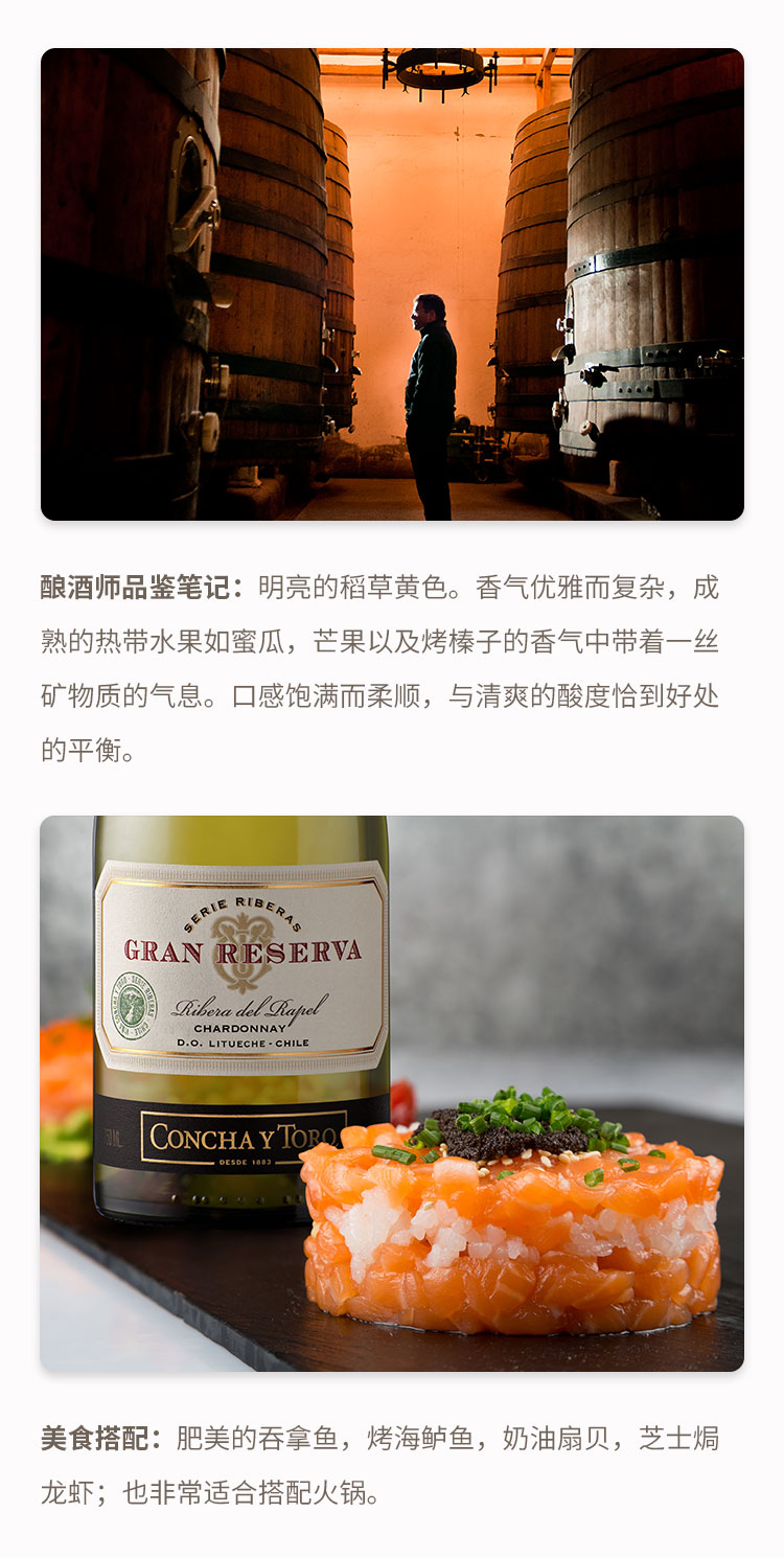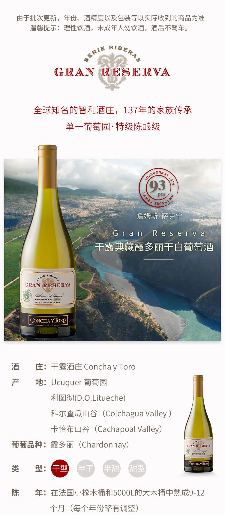 颜色:柠檬黄;口感:饱满;特性:普通餐酒;国产/进口:海外直采;适用场景:礼节拜访,商务宴请,婚礼婚宴,情侣约会,家庭聚会,自斟自饮,闺蜜私语,派对活动;包装:瓶装;类别:白葡萄酒;葡萄品种:霞多丽(Chardonnay);产地:智利;容量:750mL;甜度:干型;保质期:10年;酒精度:以实物为准;原产地:智利;存储方法:常温、避光、卧放;容量:750ml;产品重量:1.34kg;包装清单:葡萄酒1瓶;