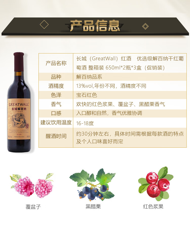 颜色:宝石红;口感:柔和;特性:其它;国产/进口:国产;适用场景:家庭聚会,礼节拜访,商务宴请,婚礼婚宴,情侣约会,自斟自饮,派对活动;包装:礼盒装;酸度:中酸;类别:红葡萄酒;葡萄品种:其它;类型:静止酒;香型:果香;产地:中国大陆;容量:376-749mL;甜度:干型;系列:礼盒;保质期:3650天;酒精度:12.5%vol;原产地:中国大陆;存储方法:避免阳光直射,于5℃~25℃干燥通风处卧放或倒放为宜;容量:650ml;产品重量:7.12kg;包装清单:长城(GreatWall)葡萄酒 优选级解百纳干红葡萄酒(促销装)整箱装 650ml*2瓶*3盒*1箱;