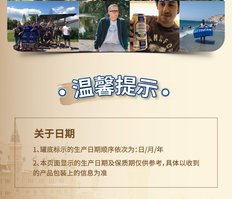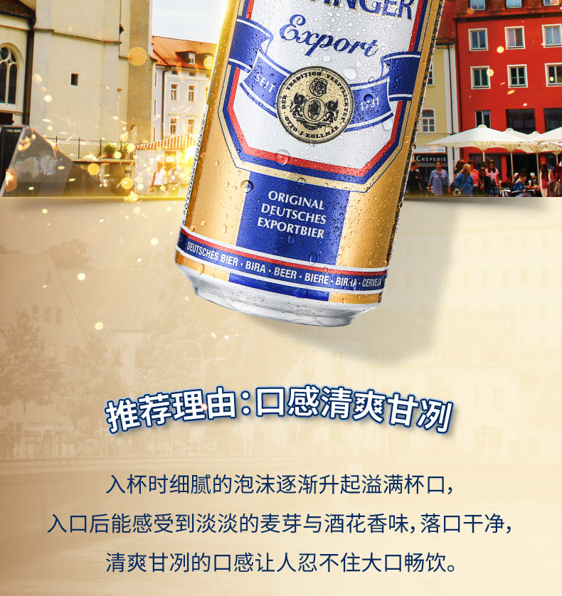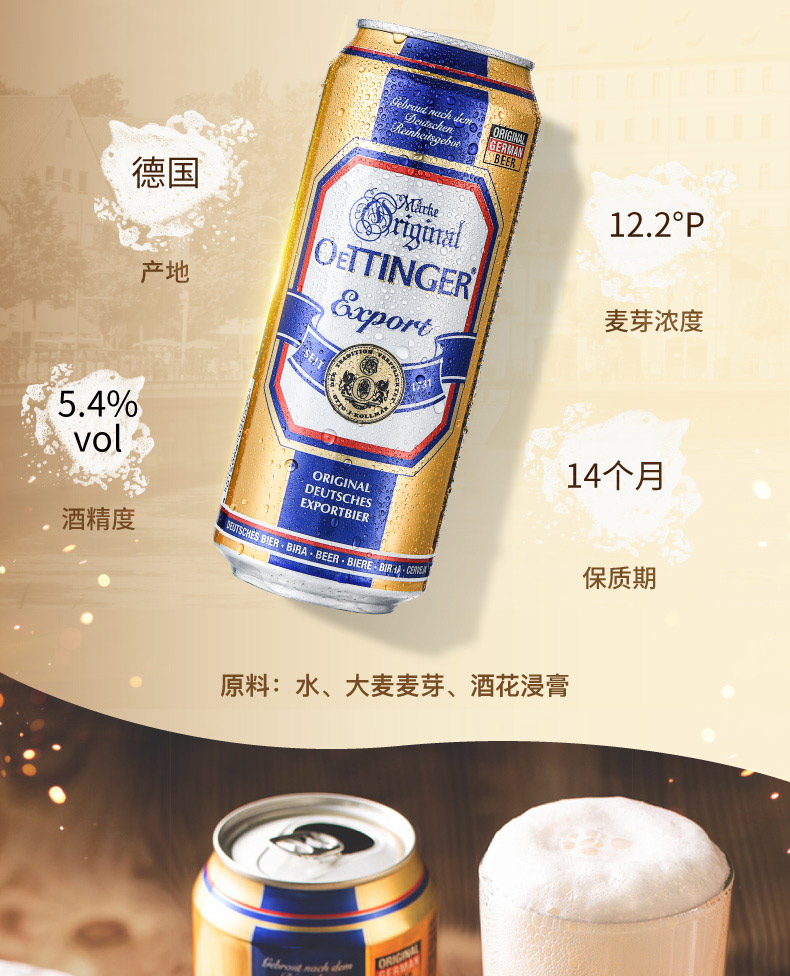 国产/进口:进口;产地:德国;适用场景:家庭聚会,礼节拜访,情侣约会,自斟自饮,派对必备,烧烤撸串,酒吧夜店;包装:组合装;容量:500mL;类别:黄啤酒;原料:水、麦芽、酒花浸膏(即啤酒花提取物)、酵母;系列:奥丁格;保质期:14个月;酒精度:5.4%vol;原产地:德国;原麦汁浓度:12.2°P;存储方法:置于阴凉处;容量:500ml;产品重量:12.63kg;包装清单:德国奥丁格(OETTINGER)大麦啤酒500ml*24整箱装;