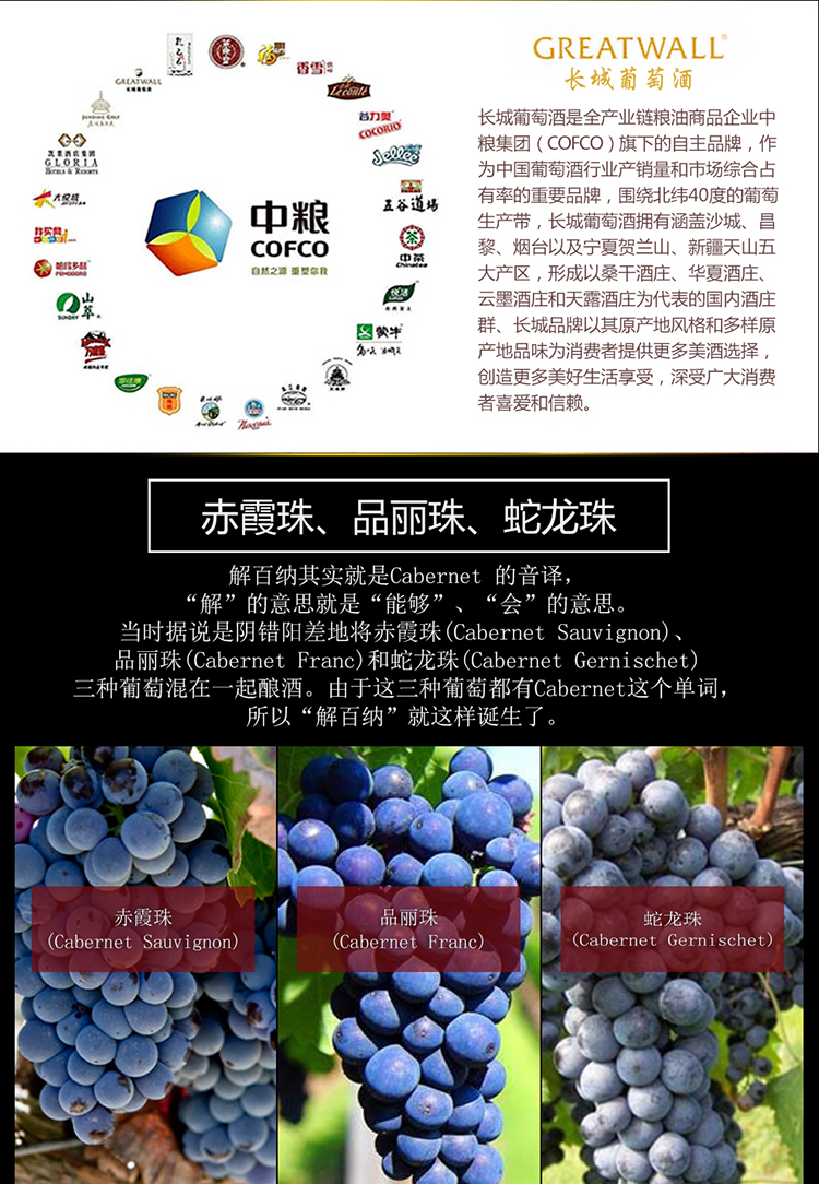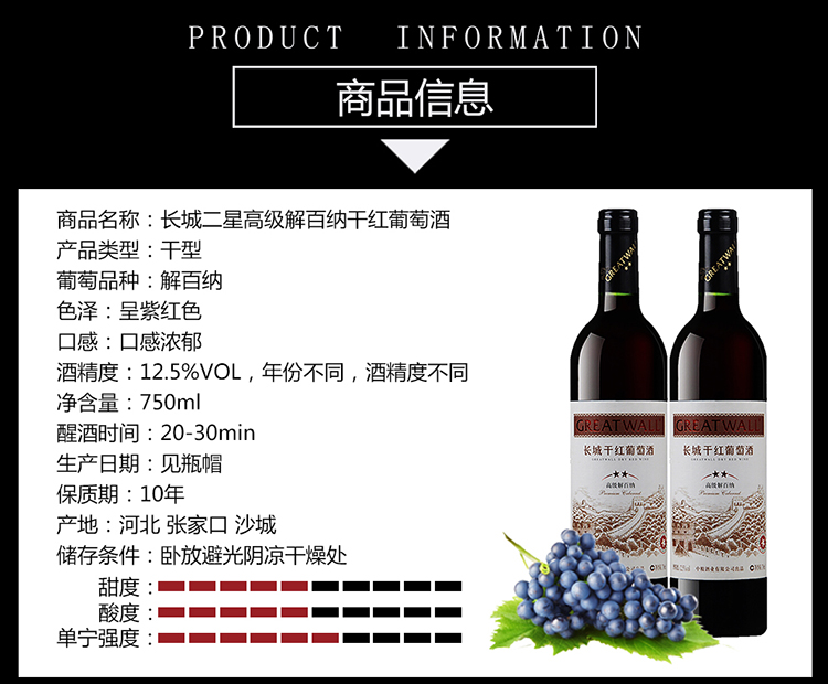 颜色:宝石红;口感:饱满;香型:果香;特性:其它;国产/进口:国产;产地:中国大陆;适用场景:商务宴请;包装:整箱装;容量:750mL以上;甜度:干型;类别:红葡萄酒;葡萄品种:其它;保质期:3650;酒精度:12.5%vol;原产地:中国大陆;存储方法:避免阳光直射,于5℃-25℃干燥通风处卧放或倒放为宜。;容量:750ml*6瓶;产品重量:10kg;包装清单:长城星级系列 二星高级解百纳干红葡萄酒 整箱装 750ml*6瓶*1箱;