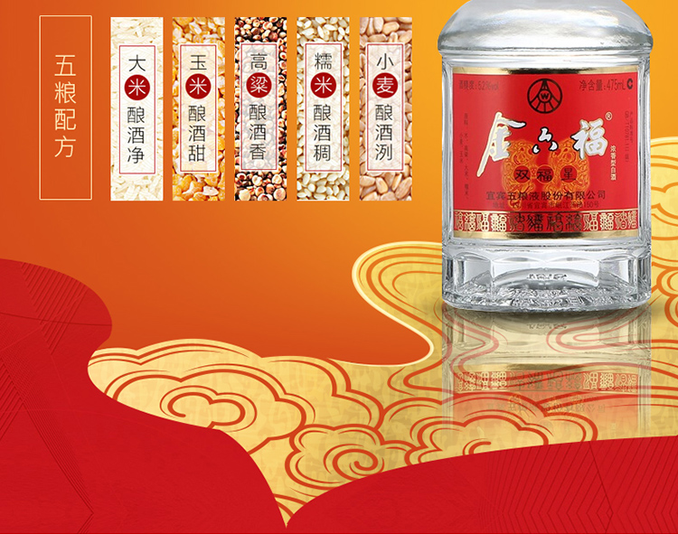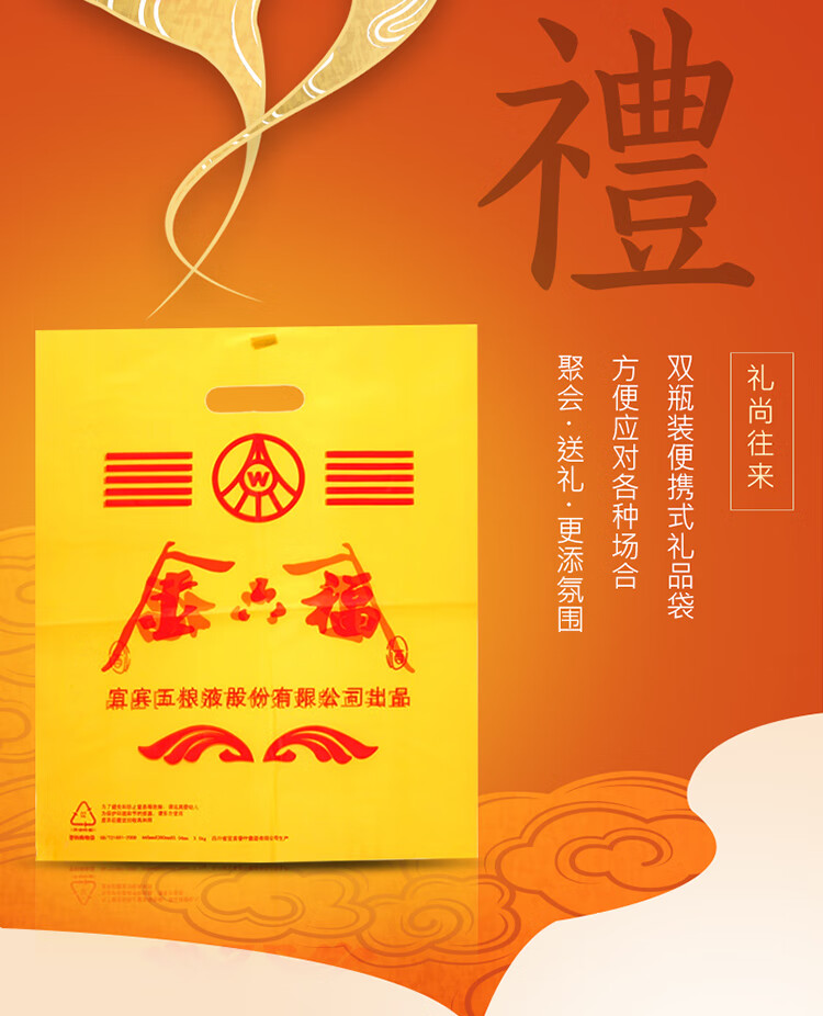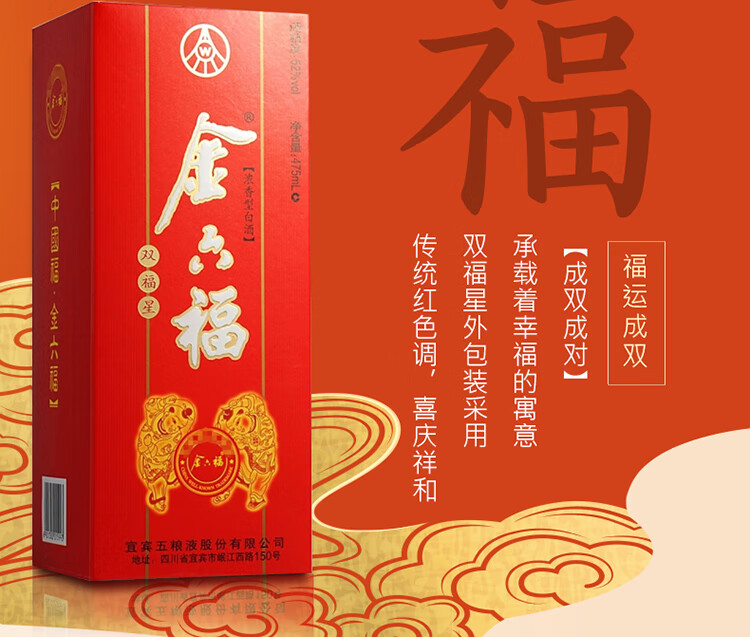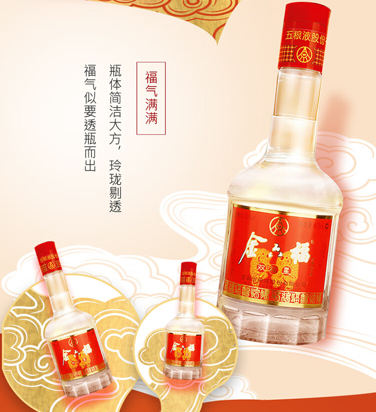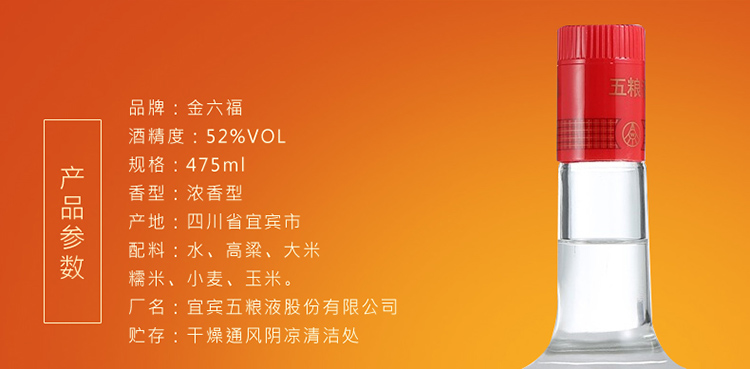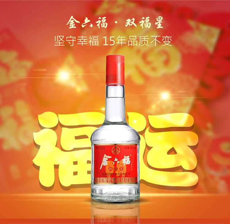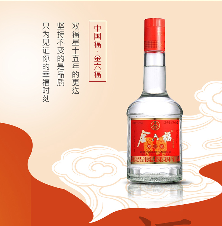 包装:整箱装;容量:376-499mL;香型:浓香型;产地:四川;度数:50度及以上;酒精度:52%vol;容量:475;产品重量:475g;包装清单:高度白酒 金六福 双福星52度整箱装(内含3支手提袋)475ml*6瓶*1;