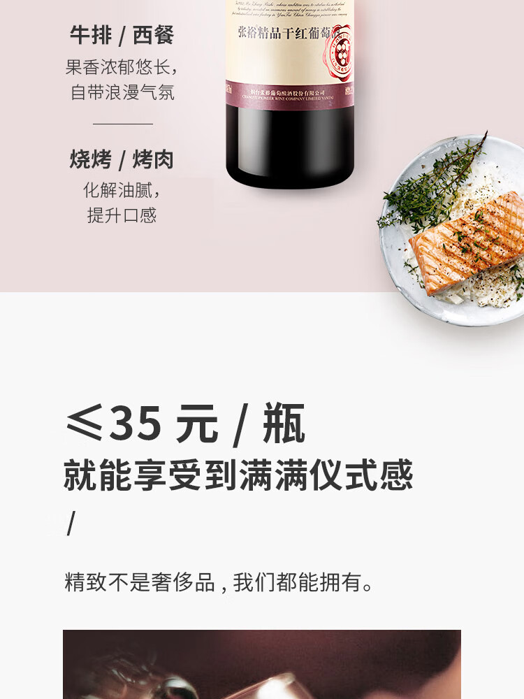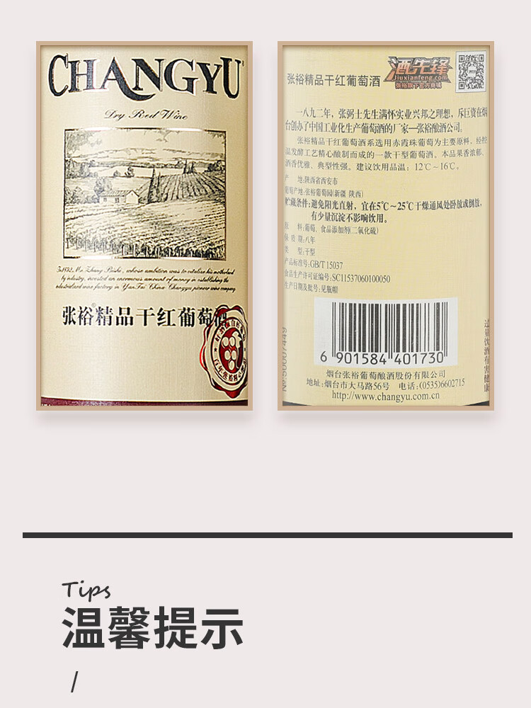 颜色:宝石红;口感:饱满;特性:普通餐酒;国产/进口:国产;适用场景:礼节拜访,商务宴请,婚礼婚宴,情侣约会,家庭聚会,自斟自饮,闺蜜私语,派对活动;包装:整箱装;酸度:中酸;类别:红葡萄酒;葡萄品种:赤霞珠(Cabernet Sauvignon);类型:静止酒;香型:花香,植物,果香;产地:中国大陆;容量:750mL以上;甜度:干型;保质期:8年;酒精度:12%vol;原产地:中国大陆;存储方法:避免阳光直射,于5℃~25℃干燥通风处卧放或倒放有少量沉淀不影响饮用;容量:750ml;产品重量:7.74kg;包装清单:张裕精品干红葡萄酒 750ml×6瓶;