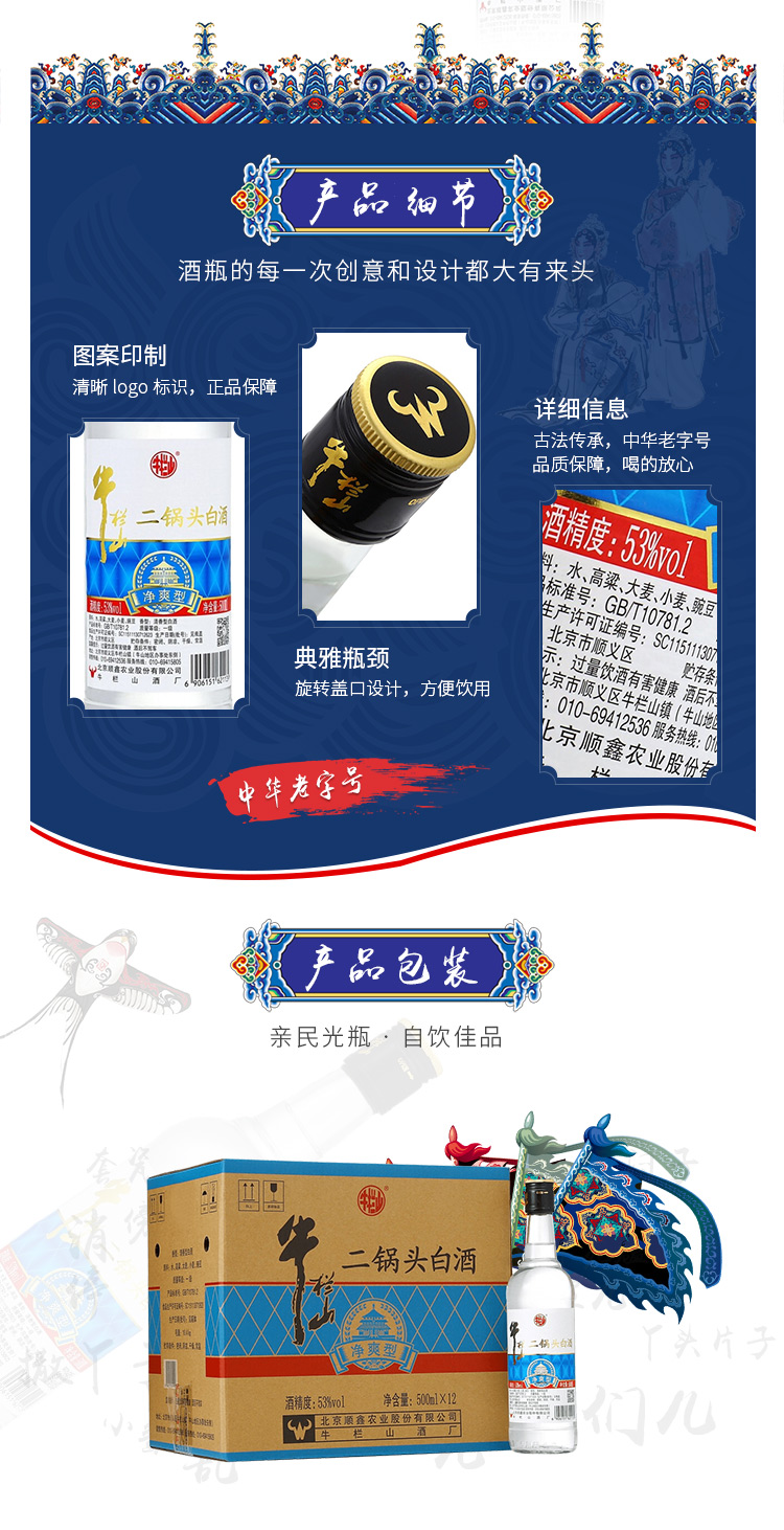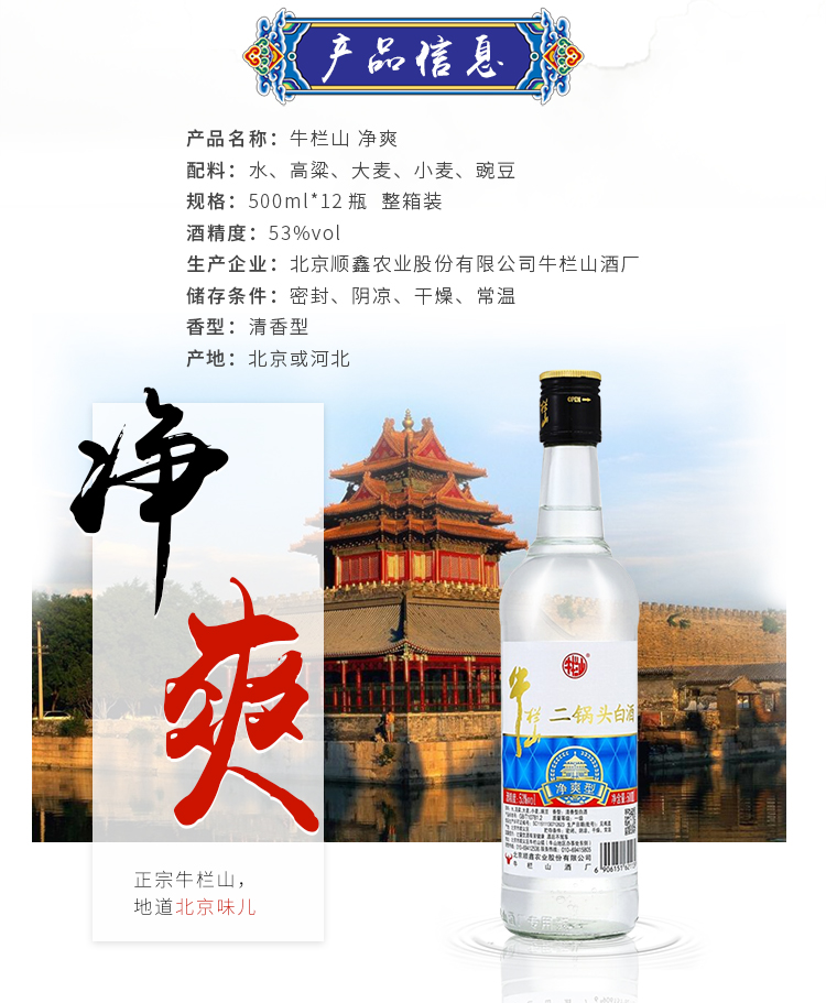 包装:整箱装;容量:376-499mL;香型:清香型;产地:北京;度数:50度及以上;酒精度:53%vol;容量:500ml;产品重量:9970g;包装清单:牛栏山 净爽 二锅头 53度 500ml*12瓶 整箱装 清香型白酒*1;