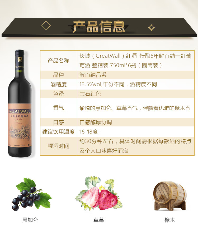 颜色:宝石红;口感:饱满;特性:精品葡萄酒;国产/进口:国产;适用场景:家庭聚会,礼节拜访,商务宴请,婚礼婚宴,情侣约会,自斟自饮,闺蜜私语,派对活动;包装:礼盒装;酸度:中酸;类别:红葡萄酒;葡萄品种:赤霞珠(Cabernet Sauvignon),蛇龙珠(Cabernet Gernischt),品丽珠(Cabernet Franc);类型:静止酒;香型:果香,木香;产地:中国大陆;容量:750mL;甜度:干型;系列:特酿;保质期:3650天;酒精度:12.5%vol;原产地:中国大陆;存储方法:避免阳光直射,于5℃~25℃干燥通风处卧放或倒放为宜。;容量:750ml;产品重量:8.77kg;包装清单:长城特酿6年解百纳干红葡萄酒(圆筒)整箱装 750ml*6瓶 *1箱;