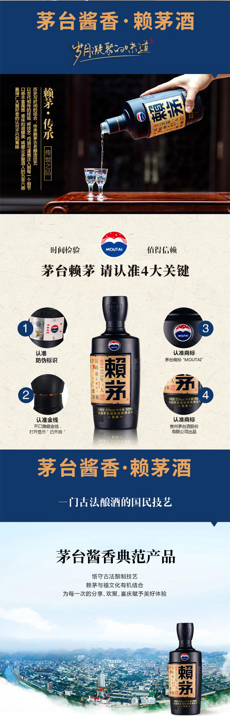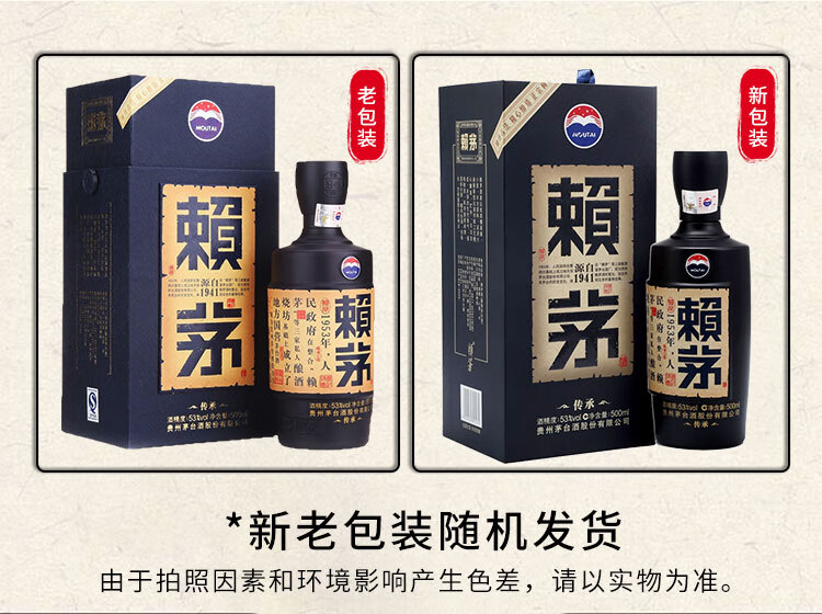 包装:整箱装;容量:376-499mL;香型:酱香型;度数:50度及以上;产地:贵州;酒精度:53%vol;产品重量:7000g;容量:500ml;包装清单:茅台 赖茅(传承·蓝)53度整箱装500ml*6瓶*1;