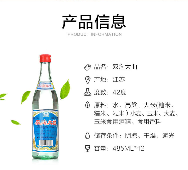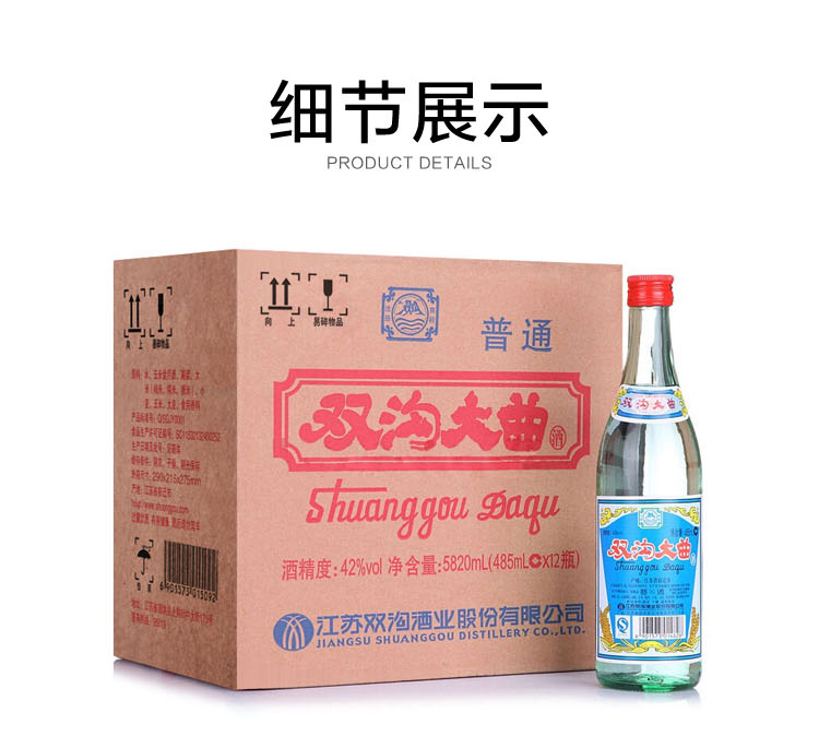 包装:整箱装;容量:376-499mL;香型:浓香型;度数:40-49度;香型:浓香型;产地:江苏;酒精度:42;包装:整箱装;产品重量:10.28g;容量:485ml;包装清单:双沟 大曲玻瓶酒整箱装 42度485ml*12瓶 X1;