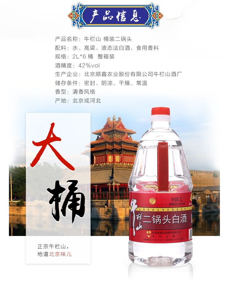 包装:桶装;容量:750mL及以上;香型:清香型;产地:北京;度数:40-49度;酒精度:42%vol;容量:2000ml;产品重量:127000g;包装清单:牛栏山42度桶二锅头2000ml 整箱装*1;