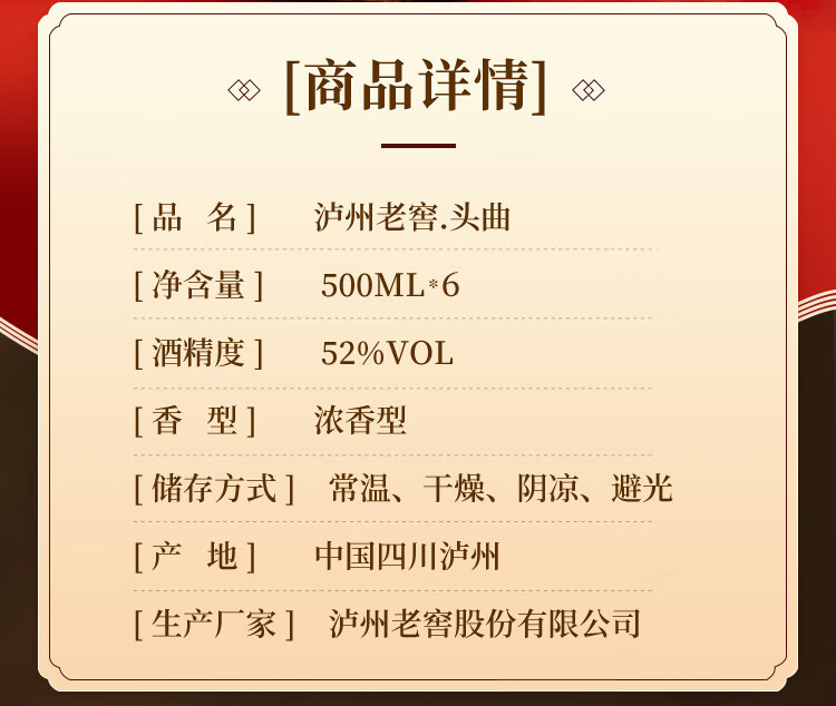包装:整箱装;容量:376-499mL;香型:浓香型;产地:四川;度数:50度及以上;酒精度:52%vol;容量:500ml*6瓶;产品重量:7900g;包装清单:泸州老窖头曲整箱装52度500ml*6盒 X1;