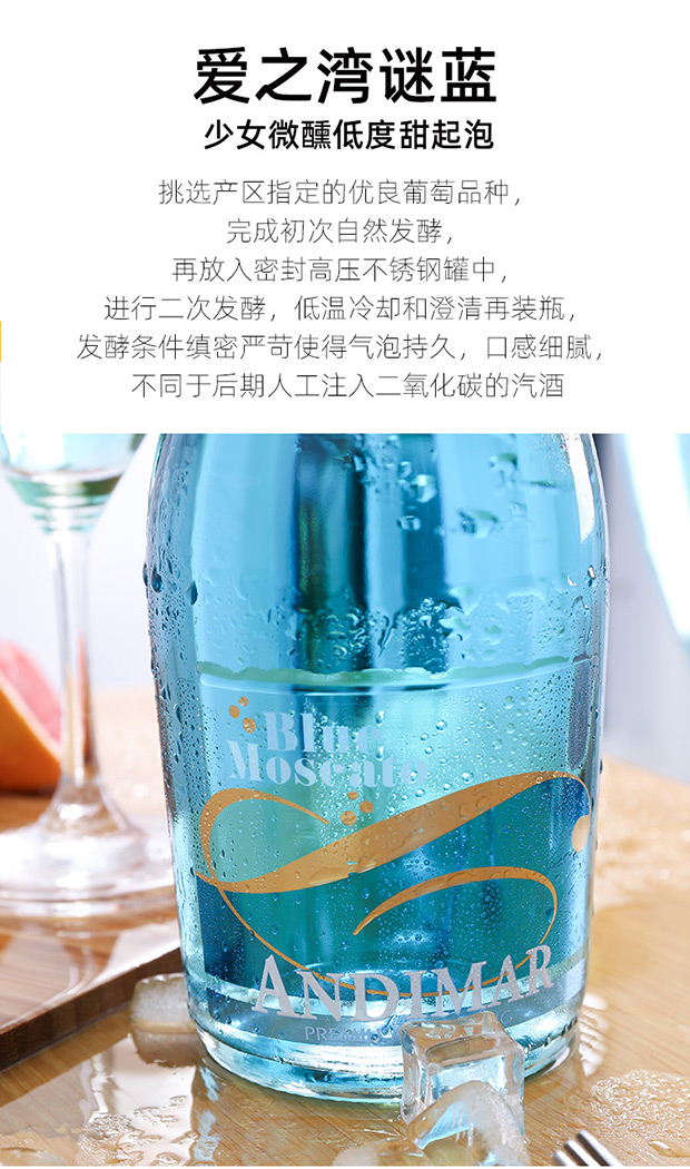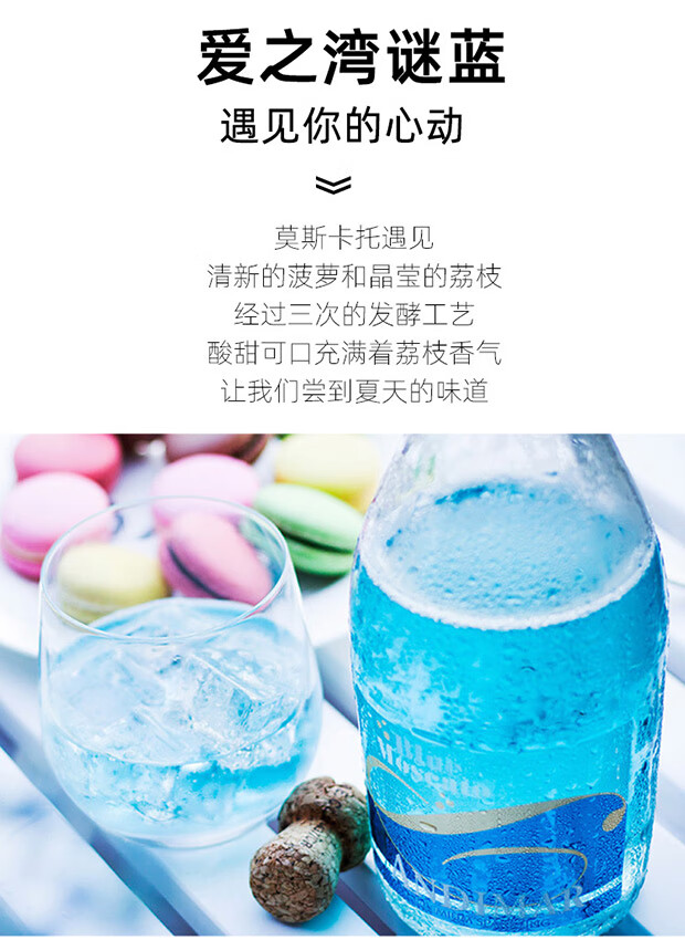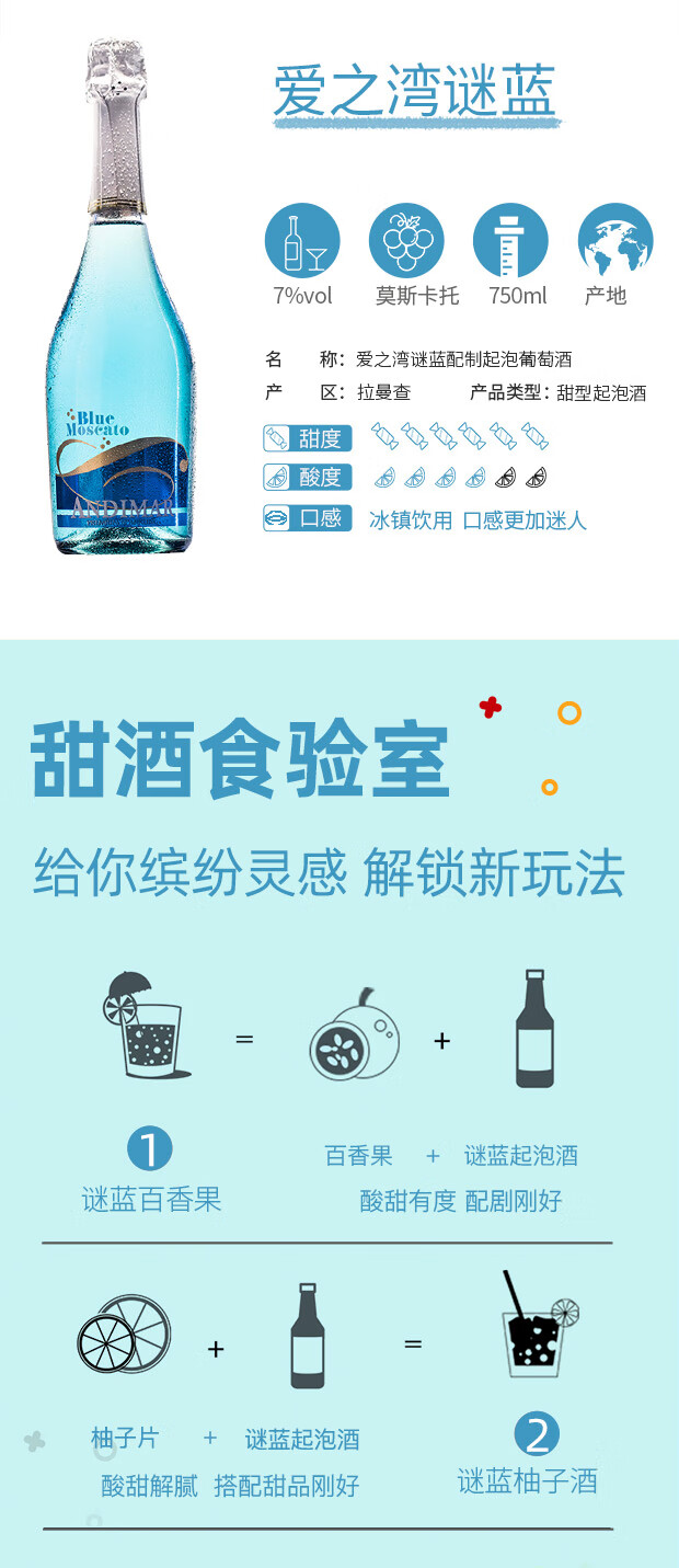 颜色:淡绿;口感:清新;特性:普通餐酒;国产/进口:进口;适用场景:商务宴请,婚礼婚宴,情侣约会,闺蜜私语,派对活动;包装:瓶装;酸度:低酸;类别:起泡酒/香槟;葡萄品种:其它;类型:其它;香型:花香;产地:西班牙;容量:750mL;甜度:甜型;保质期:5年;酒精度:7%vol;原产地:西班牙;存储方法:常温,阴凉平放;容量:750ml;产品重量:1.37kg;包装清单:爱之湾谜蓝起泡葡萄配制酒750ml*1瓶;