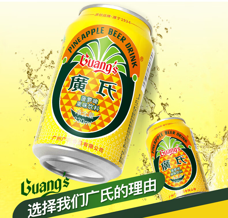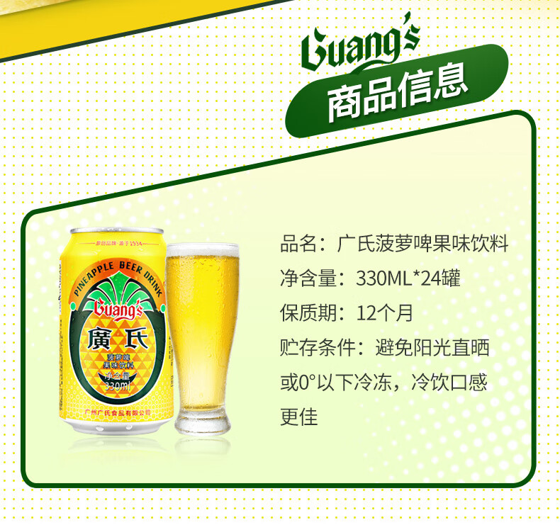 国产/进口:国产;产地:中国大陆;适用场景:礼节拜访,家庭聚会,自斟自饮,情侣约会,烧烤撸串,派对必备,酒吧夜店;包装:听装;容量:330mL;类别:无醇/果啤;原料:水、白砂糖、果葡糖浆、麦芽、啤酒花 、食品添加剂、果味香料;保质期:12个月;酒精度:0;原产地:中国大陆;原麦汁浓度:0;存储方法:禁止加热 保存于常温和干燥处;产品重量:8.5kg;容量:330ml*24罐;包装清单:广氏 菠萝麦芽味碳酸饮料 330ml*24罐;
