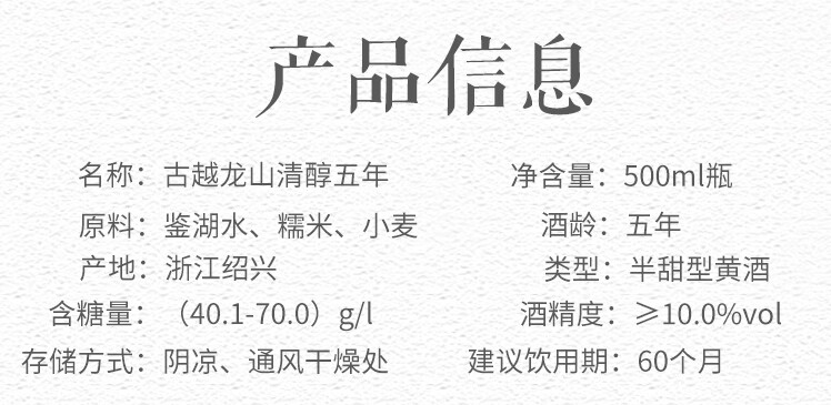 口味:半甜型黄酒(总糖:40.0-100.0g/L);度数:10-19度;产地:其它;适用场景:家庭聚会,礼节拜访,商务宴请,自斟自饮,朋友小聚;包装:瓶装;容量:500-999mL;保质期:60个月;酒精度:14;存储方法:阴凉干燥;容量:500mL;产品重量:0.8kg;包装清单:古越龙山清醇五年黄酒500ml*1;