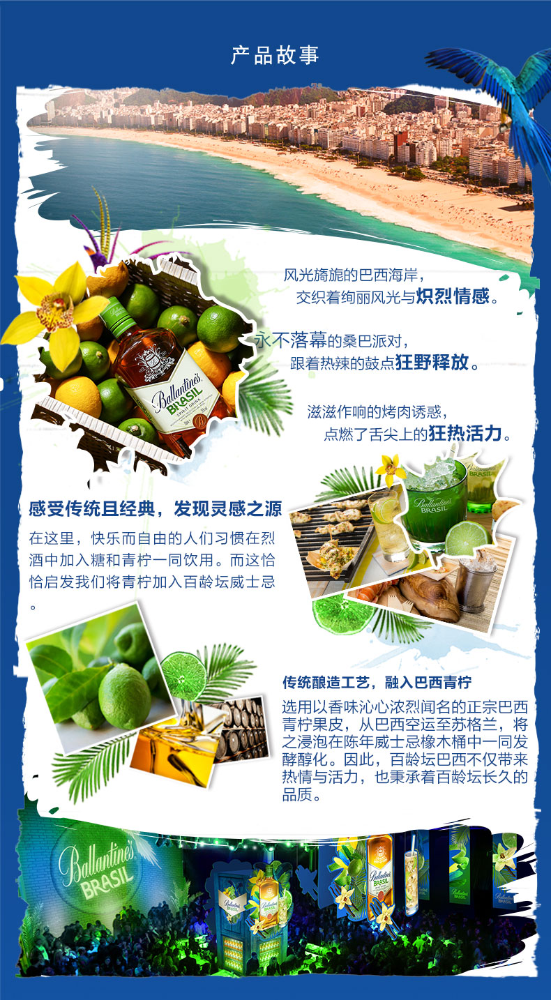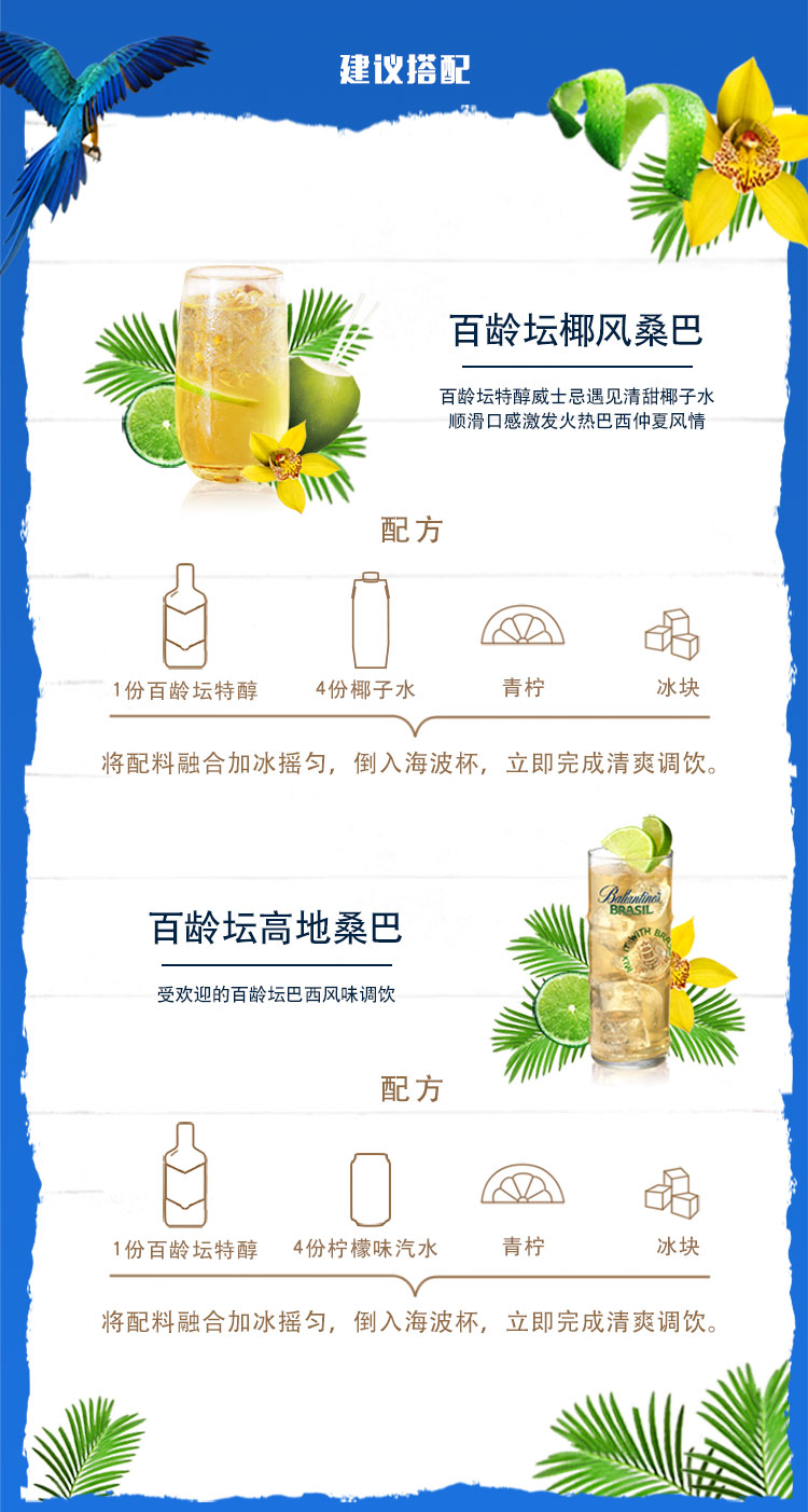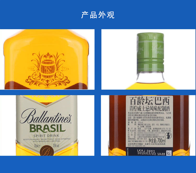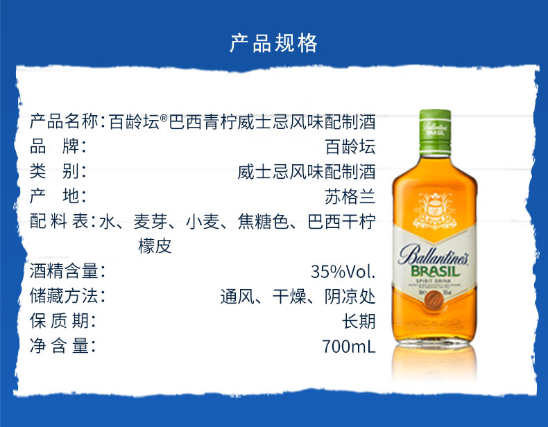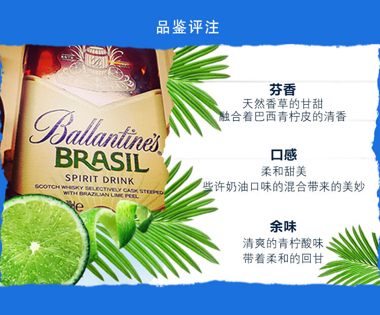 类型:调和威士忌;适用场景:自斟自饮,家庭聚会;包装:瓶装;容量:700-999mL;产地:其它;阶段:小白入门;原料:水、麦芽、小麦、焦糖色等;保质期:无;酒精度:40%vol;存储方法:常温避光;产品重量:1.09kg;容量:700mL;包装清单:百龄坛 (Ballantine’s)洋酒 巴西 青柠 威士忌风味配制酒 700ml*1;