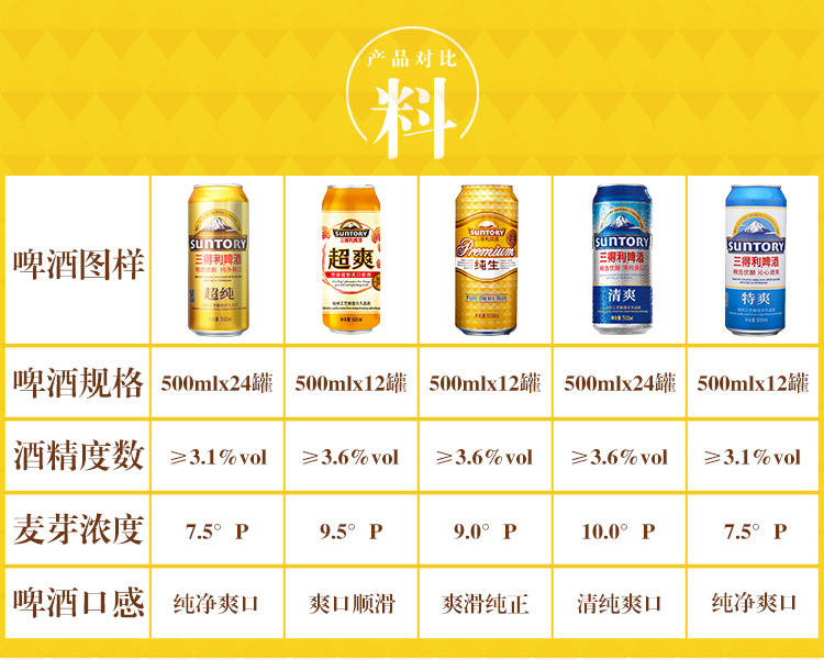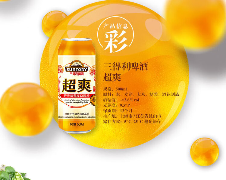 国产/进口:国产;产地:中国大陆;适用场景:礼节拜访,家庭聚会,自斟自饮,烧烤撸串,派对必备;包装:听装;容量:500mL;类别:黄啤酒;原料:水、麦芽、大米、糖浆、酒花制品;系列:超爽;保质期:12个月;酒精度:≥3.6%vol;原产地:中国大陆;原麦汁浓度:9.5°P;存储方法:5℃~25℃避光保存;产品重量:6.5kg;容量:500ml;包装清单:三得利(Suntory)超爽500ml×12听整箱一箱;
