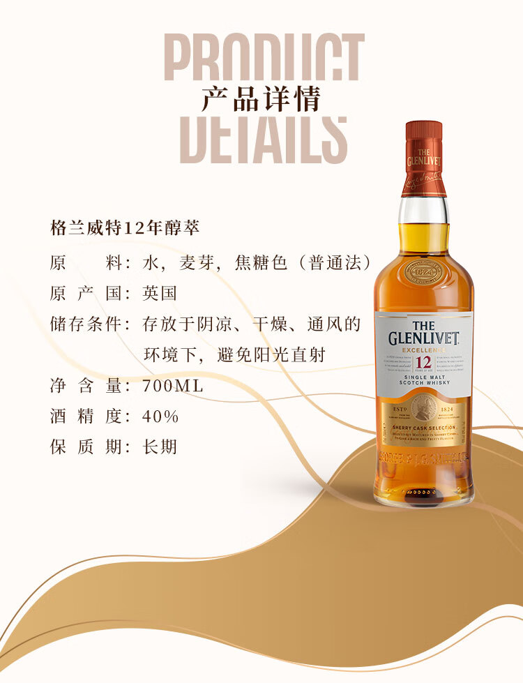 类型:单一麦芽威士忌;产地:苏格兰;适用场景:情侣约会,闺蜜私语,自斟自饮,亲友馈赠,家庭聚会,商务宴请;包装:瓶装;容量:700-999mL;阶段:小白入门;原料:水、麦芽、焦糖色;保质期:无;酒精度:40%vol;存储方法:常温避光;产品重量:1.37kg;容量:700mL;包装清单:格兰威特(Glenlivet)洋酒 醇萃12年单一麦芽苏格兰威士忌 700ml*1;