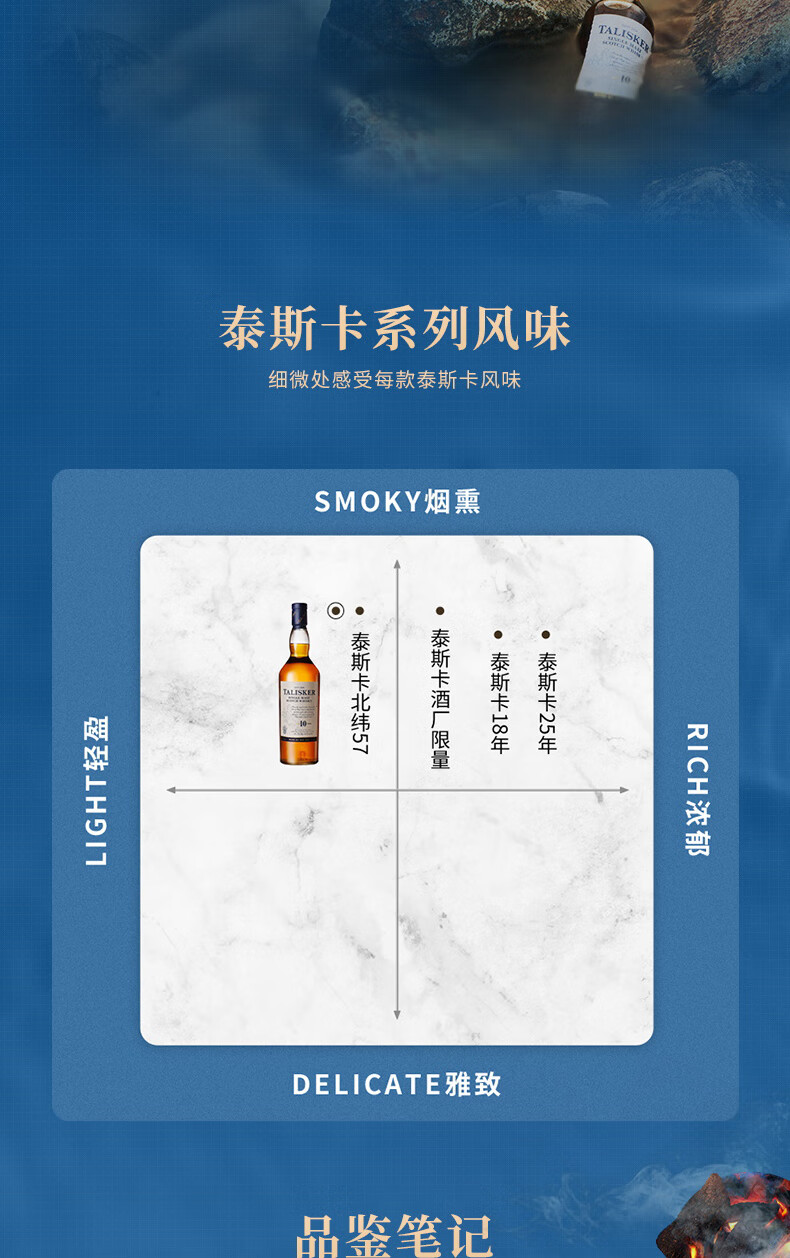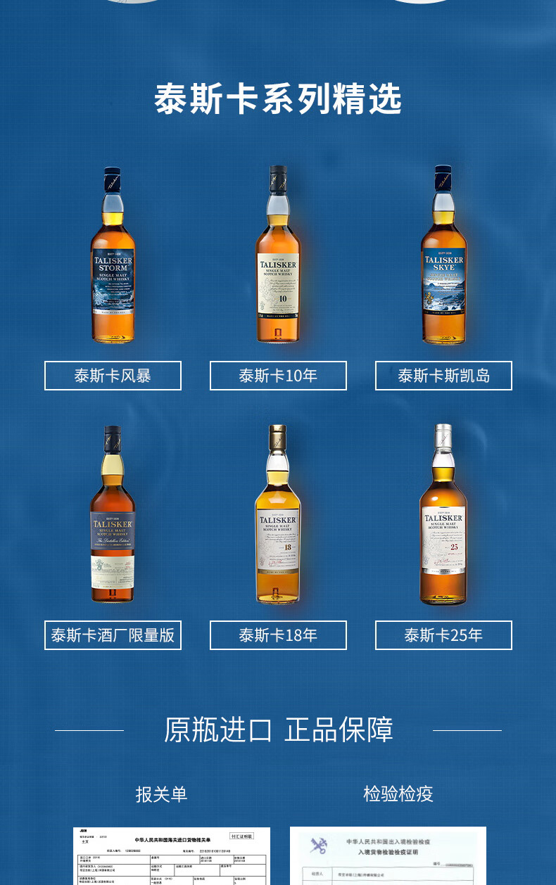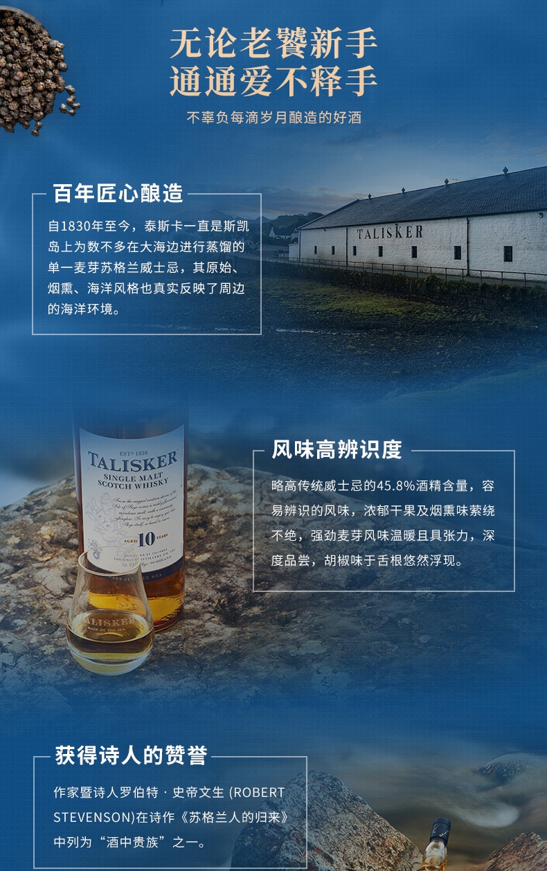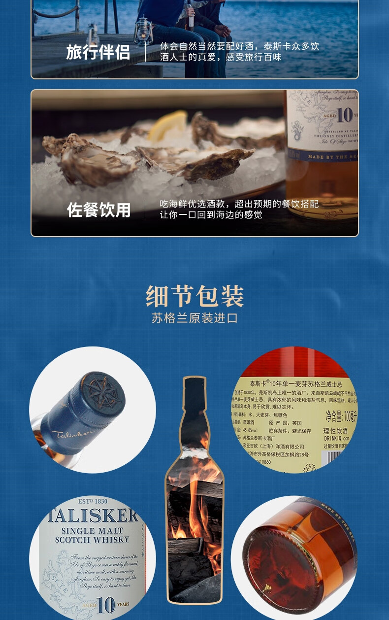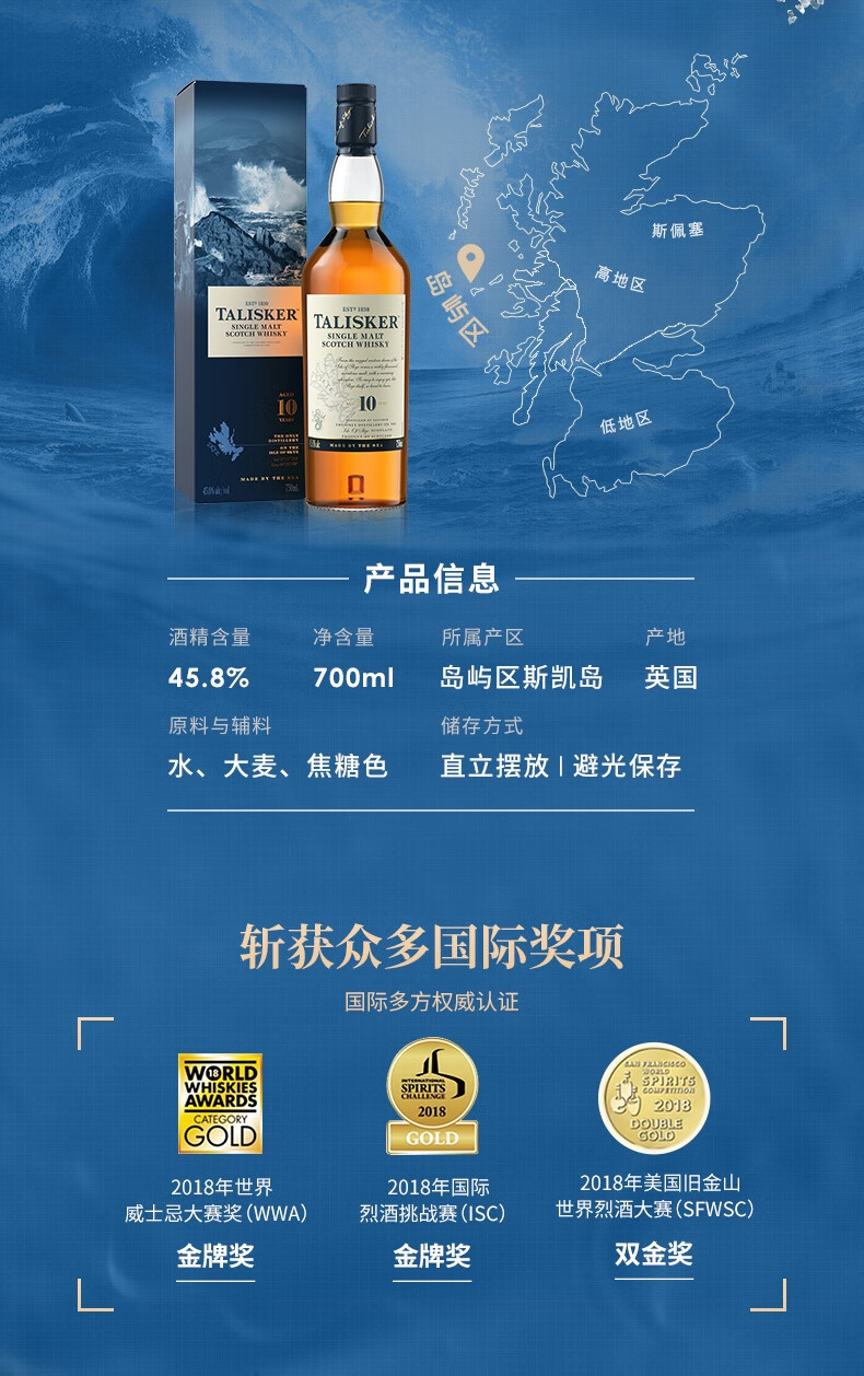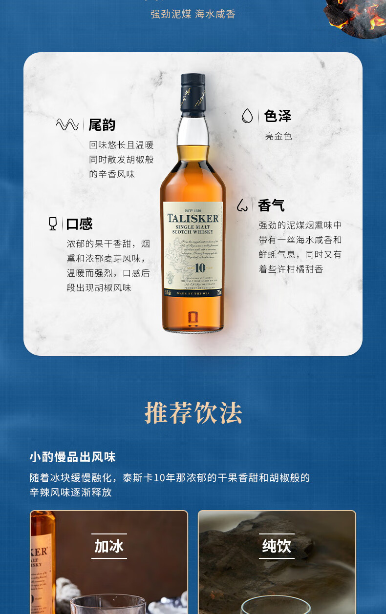 类型:单一麦芽威士忌;产地:其它;适用场景:自斟自饮,亲友馈赠,家庭聚会,商务宴请,情侣约会,闺蜜私语;包装:瓶装;容量:700-999mL;阶段:进阶优选;原料:水、大麦芽、焦糖色;保质期:无;酒精度:45.8%vol;存储方法:常温避光保存;产品重量:1.3kg;容量:700mL;包装清单:泰斯卡(Talisker)洋酒 岛屿产区 10年单一麦芽苏格兰威士忌700ml *1;