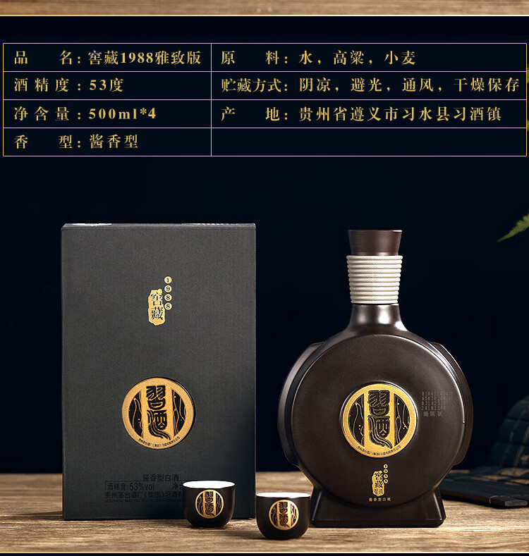 包装:整箱装;容量:500-749mL;香型:酱香型;产地:贵州;度数:50度及以上;酒精度:53%vol;容量:2000ml;产品重量:5.19g;包装清单:茅台 习酒 窖藏1988 雅致版 53度整箱特惠装 500ml*4;