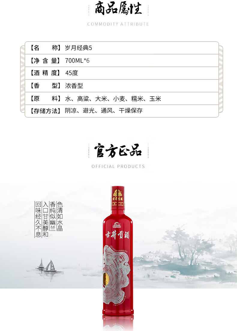 包装:整箱装;容量:500-749mL;香型:浓香型;产地:安徽;度数:40-49度;酒精度:45%vol;容量:700;产品重量:11.63g;包装清单:古井贡酒岁月经典5年陈酿45度整箱装700ml×6瓶×1箱;