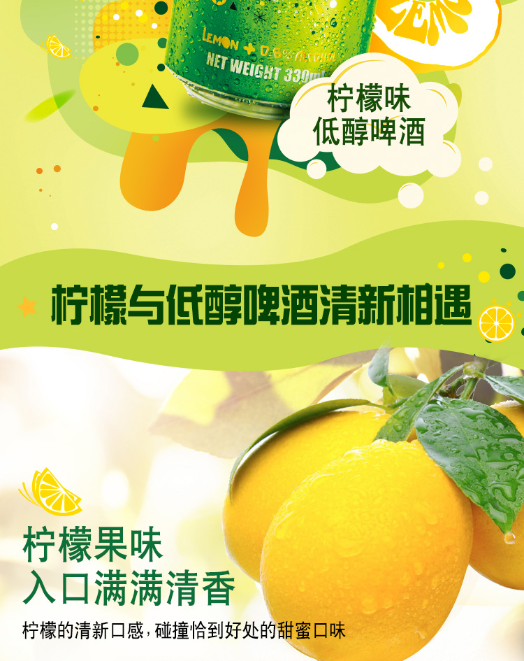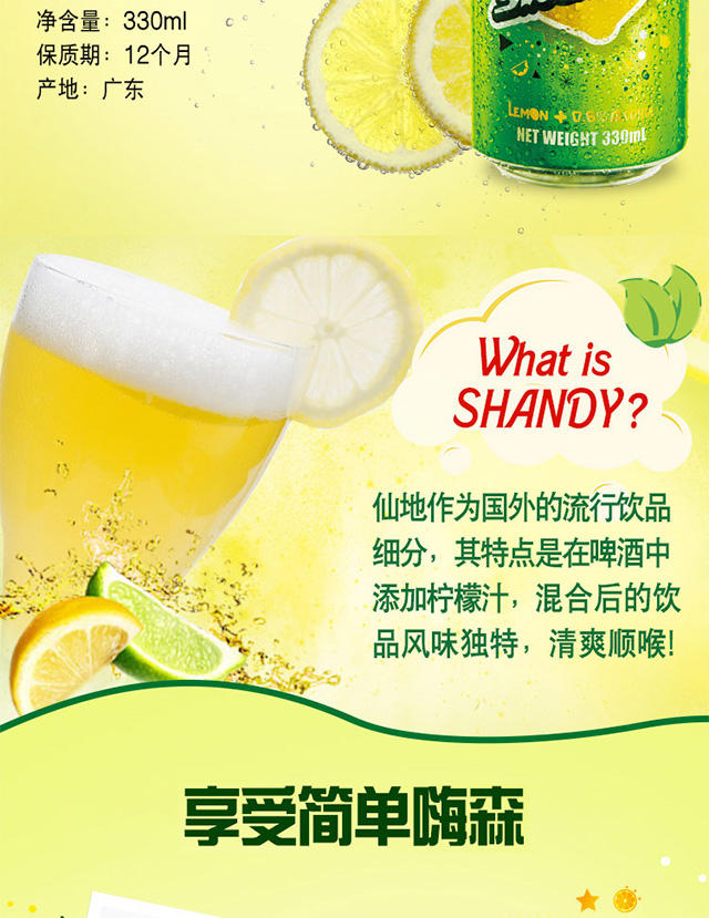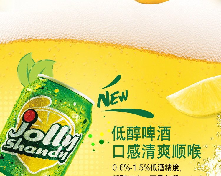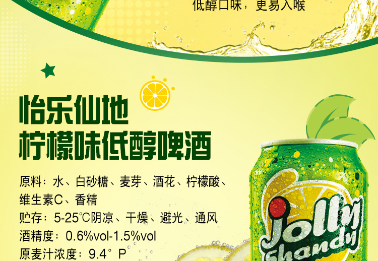 国产/进口:国产;产地:中国大陆;适用场景:家庭聚会,礼节拜访,情侣约会,自斟自饮,派对必备,烧烤撸串,酒吧夜店,野餐出游;包装:听装;容量:330mL;类别:无醇/果啤;原料:水、麦芽、白砂糖、酒花、食品添加剂;国产/进口:国产;保质期:365天;酒精度:0.6%vol~1.5%vol;原产地:其它;原麦汁浓度:9.4`P;存储方法:避光通风;类别:无醇/果啤;包装:听装;产品重量(kg):8.496;容量:330ml;包装清单:怡乐仙地 (Jolly Shandy)果味啤酒柠檬味330ml*24听*1;