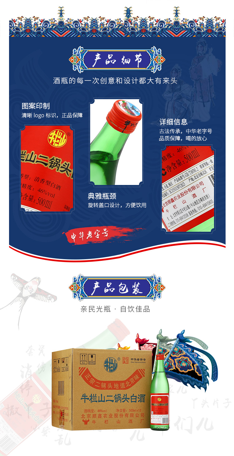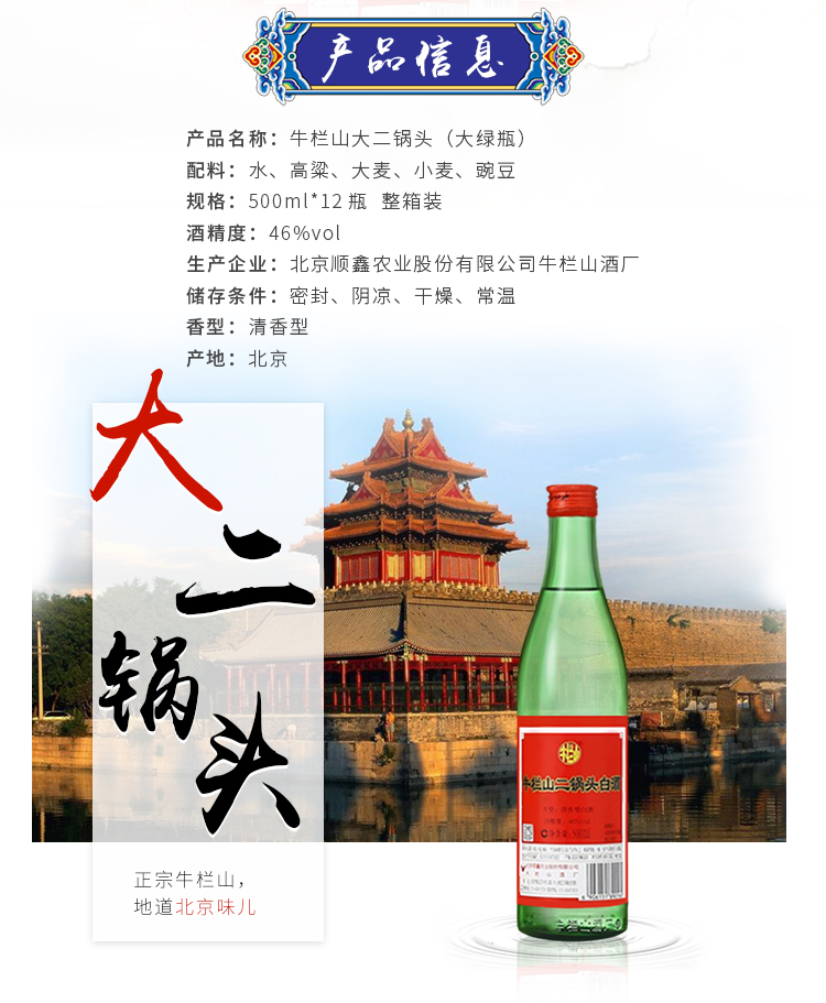 包装:整箱装;容量:376-499mL;香型:清香型;产地:北京;度数:40-49度;酒精度:46%vol;容量:500ml;产品重量:106100g;包装清单:牛栏山 大二锅头 46度 500ml*12瓶 整箱装(绿瓶)清香型白酒*1;
