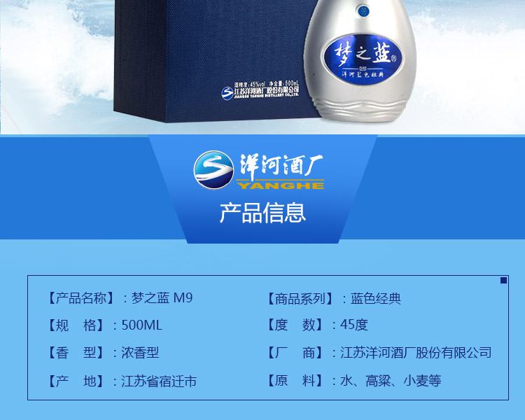 包装:瓶装;容量:376-499mL;香型:浓香型;度数:40-49度;容量:500ml;产品重量(kg):2.28kg;包装:单瓶;存储方法:干燥阴凉处;酒精度:45;香型:浓香型;等级:优级;省份:江苏;包装清单:梦之蓝M9 45度 单瓶装白酒500ml*1;