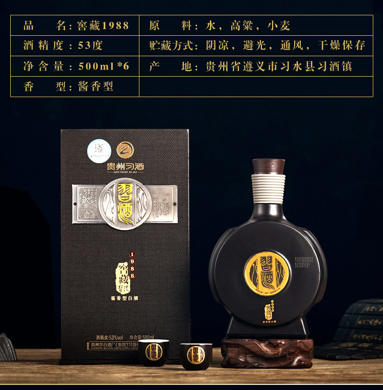 包装:整箱装;容量:500-749mL;香型:酱香型;产地:贵州;度数:50度及以上;酒精度:53%vol;容量:3000ml;产品重量:10.78g;包装清单:习酒 53度500ml窖藏1988 × 6;