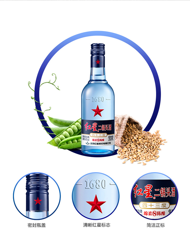 包装:整箱装;容量:375mL及以下;香型:清香型;度数:40-49度;产地:北京市,天津市,山西晋中市;酒精度:43%vol;产品重量:11800g;容量:250ml;包装清单:红星二锅头 蓝瓶绵柔8陈酿 43度 250ml*24;